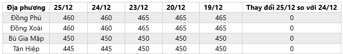 + Thị trường Mủ cao su ngày 25/12: Giá mủ nước thu mua tại Bình Phước không đổi so với hôm trước, dao động 445-460 đồng/độ. Thời tiết mưa nhiều khiến người dân ít cạo mủ, lượng mủ cũng thấp. Trong khi đó, giá mủ chén đi ngang so với hôm trước, đạt mức 17.500-18.500 đồng/kg.