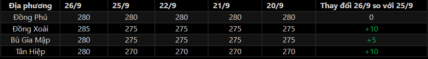 + Thị trường Mủ cao su ngày 26/9: Giá mủ nước thu mua tại Bình Phước tăng 5-10 đồng/độ so với hôm trước, dao động 280-285 đồng/độ. Trong khi giá mủ chén tiếp tục giữ ổn định, đạt mức 11.000-12.000 đồng/kg.