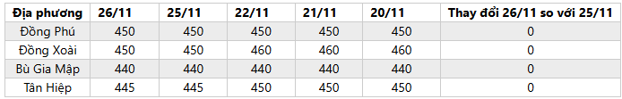 + Thị trường Mủ cao su ngày 26/11: Giá mủ nước thu mua tại Bình Phước không đổi so với hôm trước, dao động 440-450 đồng/độ. Trong khi giá mủ chén giữ ổn định so với hôm trước, đạt mức 16.500-18.000 đồng/kg.