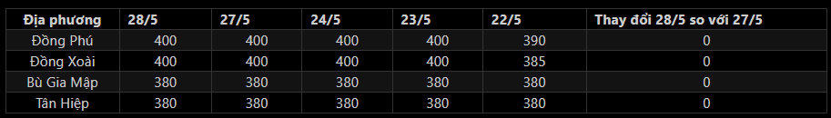 + Thị trường Mủ cao su ngày 28/5: Giá mủ nước thu mua tại Bình Phước giữ ổn định so với hôm trước, dao động 380-400 đồng/độ. Trong khi giá mủ chén không đổi so với hôm trước, đạt mức 18.000-20.000 đồng/kg.