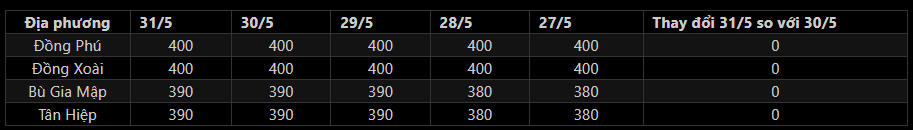 - Giá mủ nước thu mua tại Bình Phước tiếp tục không đổi.