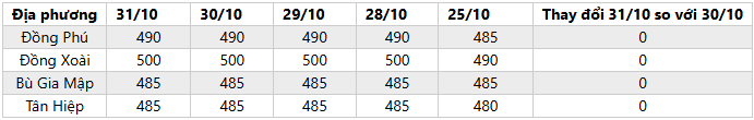 + Thị trường Mủ cao su ngày 31/10: Giá mủ nước thu mua tại Bình Phước giữ ổn định so với hôm trước, dao động 485-500 đồng/độ. Trong khi giá mủ chén tiếp tục tạm chững ở mức cao so với hôm trước, đạt mức 19.000-21.000 đồng/kg.