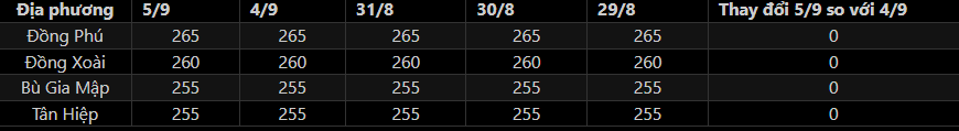 + Thị trường Mủ cao su ngày 5/9: Giá mủ cao su thu mua tại Bình Phước không đổi sau kỳ nghỉ lễ. Giá mủ nước dao động 255-265 đồng/độ. Trong khi giá mủ chén đạt mức 11.500-13.000 đồng/kg.
