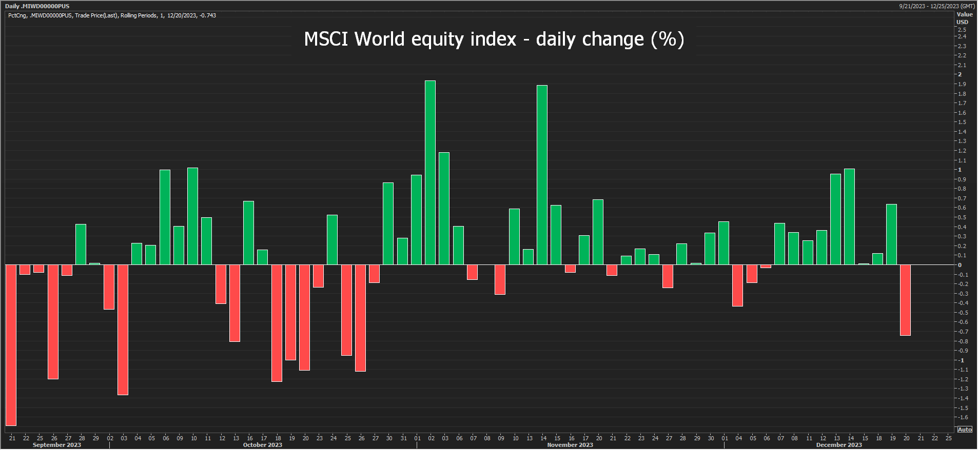Cổ phiếu toàn cầu, đã tăng 10 ngày liên tiếp và đang trên đà đạt mức tăng dài nhất trong gần ba năm, nay đã giảm 0,7% và ghi nhận mức giảm lớn nhất trong hai tháng. Ba chỉ số chính của Hoa Kỳ, ở mức cao kỷ lục hoặc gần mức cao kỷ lục trong tuần này, cũng ghi nhận mức giảm hàng ngày lớn nhất kể từ tháng 10.