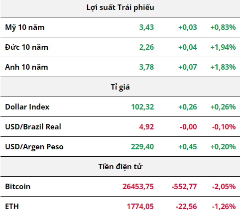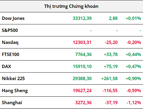 Các chỉ số chứng khoán Mỹ hầu như đi ngang sau tiếng chuông mở cửa, chỉ số Dow Jones chỉ tăng 2 điểm trong khi Nasdaq 100 giảm nhẹ 0,2% trong bối cảnh cuộc họp giữa Tổng thống Biden và các nhà lãnh đạo quốc hội về vấn đề trần nợ của Mỹ dự kiến diễn ra vào thứ Sáu đã bị hoãn sang tuần sau. Tâm lý của người tiêu dùng cũng đã giảm xuống mức thấp nhất trong vòng 6 tháng khi chỉ đạt 57,7 trong tháng 5. Trong khi đó, người tiêu dùng tại Mỹ cũng đưa ra lo ngại rằng giá sẽ tăng với tốc độ trung bình 3,2% trong năm đến mười năm tới, mức cao nhất kể từ năm 2011. Về phía doanh nghiệp, cổ phiếu của tập đoàn Tesla đã tăng hơn 2% sau quyết định tăng giá bán hai mẫu xe Model X và Model S tại thị trường Mỹ.