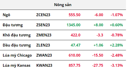 Lực mua quay trở lại mạnh mẽ với thị trường nông sản sau khi mở cửa phiên tối, giúp cho giá đậu tương cũng như giá ngô đồng loạt hồi phục và thu hẹp đáng kể mức giảm từ đầu phiên. Trong khi đó, đà giảm của giá lúa mì đã chững lại. Nhịp hồi của giá các mặt hàng chủ yếu là nhờ yếu tố kỹ thuật, trong bối cảnh các thông tin cơ bản hiện vẫn mang tính “bearish”. Trong báo cáo Bán hàng xuất khẩu (Export Sales) tối nay, USDA cho biết số liệu bán hàng đậu tương và ngô niên vụ 22/23 của Mỹ trong tuần 05/05-11/05 giảm lần lượt 72,7% và 231,8% so với một tuần trước.