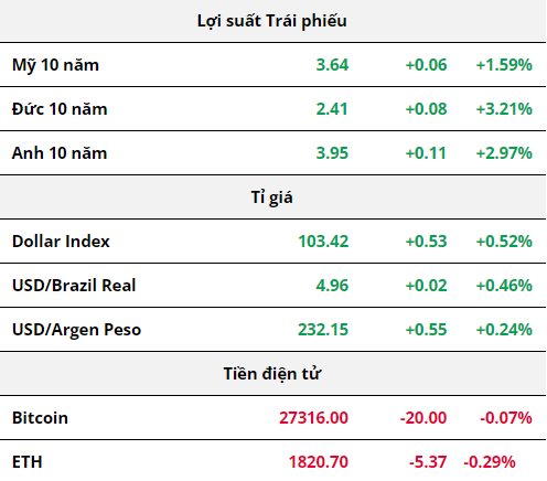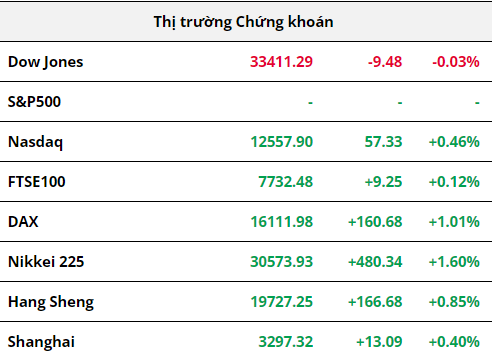 Trên thị trường chứng khoán Mỹ, chỉ số Dow Jones giảm nhẹ 0,03% xuống mức 33411,29 điểm, ngược lại chỉ số Nasdaq tăng 0,46% do những dữ liệu trái chiều được công bố vào tối ngày 18/05. Cụ thể, số đơn xin trợ cấp thất nghiệp lần đầu của Mỹ đạt mức 242.000, giảm 22.000 so với tuần kết thúc vào ngày 12/05. Bên cạnh đó, chỉ số sản xuất Philadelphia của Mỹ tháng 05/2023 giảm 10,4 điểm, mặc dù con số cho thấy sự tiêu cực nhưng vẫn cao hơn dự báo giảm 19,8 điểm của các chuyên gia kinh tế. Ở chiều ngược lại, trên thị trường bất động sản, doanh số bán nhà hiện tại của Mỹ giảm 3,4% xuống còn 4,28 triệu căn được bán ra trong tháng 04/2023.