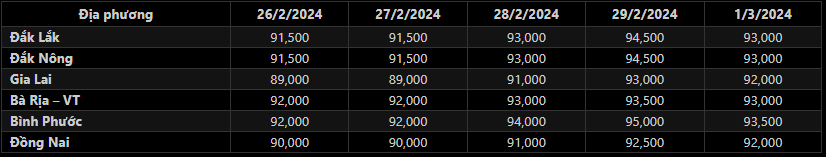 Mức giá thấp nhất trong ngày hôm nay cùng được giao dịch đồng thời tại 2 khu vực Gia Lai và Đồng Nai ở mức 92,000 đ/kg, giảm lần lượt 1,000 đ/kg tại Gia Lai và 500 đ/kg tại Đồng Nai.