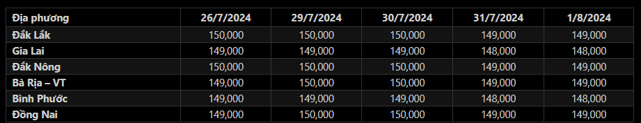 Sáng 1/8/2024, giá tiêu đen xô thu mua tại đại lý ở Tây Nguyên và Đông Nam Bộ bình ổn so với ngày hôm qua, mặt bằng giá tiêu trung bình tại các địa bàn trọng điểm neo quanh khoảng 148,000-149,000 đồng/kg. Trong đó: