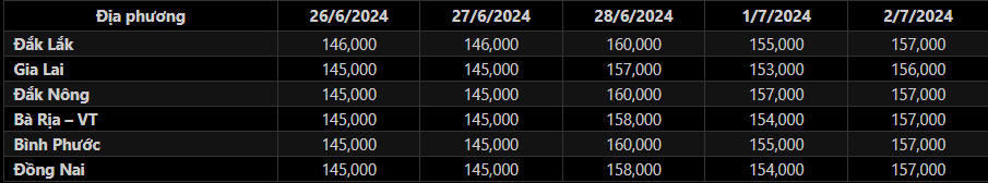 Giá tiêu tại hầu hết các địa phương Đắk Nông, Bình Phước, Đắk Lắk, Bà Rịa – Vũng Tàu và Đồng Nai đồng loạt đạt mức 157,000 đ/kg. Trong đó, so với ngày hôm qua, giá tiêu tại Bình Phước, Đắk Lắk tăng 2,000 đ/kg, tại Bà Rịa – Vũng Tàu tăng 3,000 đ/kg và tại Đồng Nai tăng 4,000 đ/kg, trong khi đó, giá tiêu tại Đắk Nông không thay dổi.