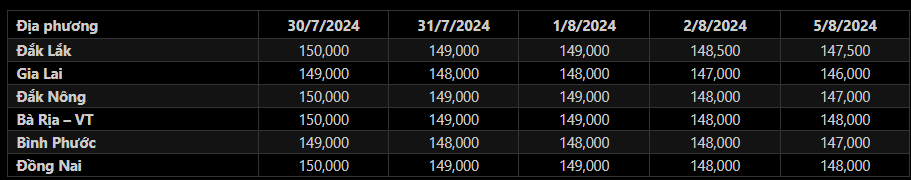 Giao dịch ở ngưỡng thấp hơn là giá tiêu được ghi nhận đồng loạt tại Bà Rịa-Vũng Tàu, Bình Phước, Đắk Nông, Đồng Nai với 148,000 đ/kg. Trong đó, giá tiêu tại Bình Phước không đổi, giá tiêu tại các địa phương còn lại giảm 100 đ/kg so với hôm qua.