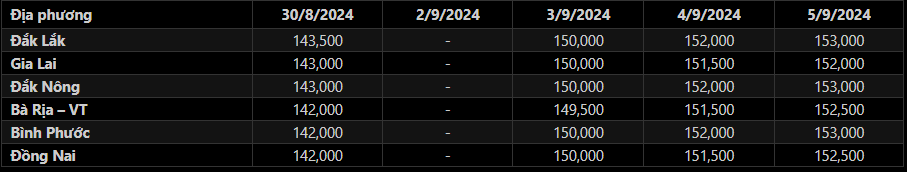 Sáng 5/9/2024, giá tiêu đen xô thu mua tại đại lý ở Tây Nguyên và Đông Nam Bộ tiếp tục tăng với mức tăng 500-1,000 đ/kg so với hôm qua, qua đó đưa mặt bằng giá tiêu trung bình tại các địa bàn trọng điểm neo quanh khoảng 152,000-153,000 đồng/kg. Trong đó: