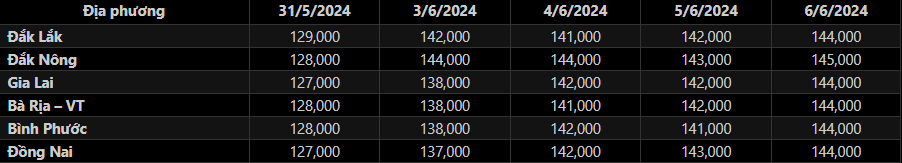 Trong khi đó, giá tiêu tại Gia Lai, Đắk Lắk, Bà Rịa – Vũng Tàu, và Đồng Nai và Bình Phước cùng đồng loạt tăng lên mức 144,000 đ/kg. Tại Bình Phước, so với ngày hôm qua, sáng nay giá tiêu tại địa phương này tăng 1,000 đ/kg trong khi các địa phương còn lại cùng chung mức tăng 2,000 đ/kg.