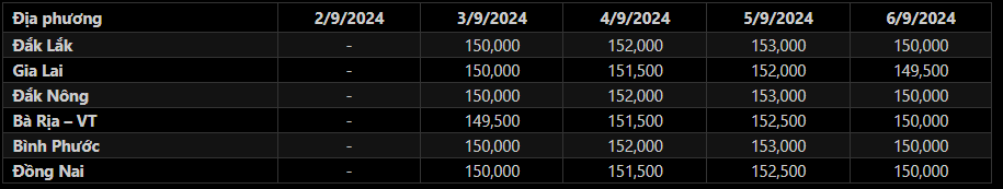 Sáng 6/9/2024, giá tiêu đen xô thu mua tại đại lý ở Tây Nguyên và Đông Nam Bộ quay đầu giảm mạnh 2,500-3,000 đ/kg, kết thúc chuỗi ngày tăng liên tiếp, qua đó đưa mặt bằng giá tiêu trung bình tại các địa bàn trọng điểm về quanh khoảng 149,500-150,000 đồng/kg. Trong đó: