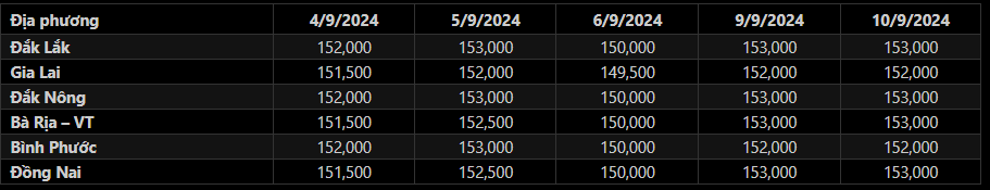 Sáng 10/9/2024, giá tiêu đen xô thu mua tại đại lý ở Tây Nguyên và Đông Nam Bộ đồng loạt chững lại sau đợt tăng vào ngày hôm qua, qua đó đưa mặt bằng giá tiêu trung bình tại các địa bàn trọng điểm tiếp tục neo quanh khoảng 152,000-153,000 đồng/kg. Trong đó: