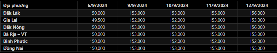 Sáng 12/9/2024, giá tiêu đen xô thu mua tại đại lý ở Tây Nguyên và Đông Nam Bộ hầu như không có nhiều biến động so với ngày hôm qua, qua đó đưa mặt bằng giá tiêu trung bình tại các địa bàn trọng điểm neo quanh khoảng 152,000-156,000 đồng/kg. Trong đó: