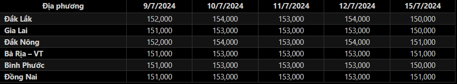 Giá tiêu tại Đắk Nông, Bà Rịa-Vũng Tàu và Đồng Nai cùng giảm xuống mức 151,000 đ/kg. Trong đó giá tiêu tại Đắk Nông giảm 2,000 đ/kg trong khi giá tiêu tại Bà Rịa-Vũng Tàu và Đồng Nai giảm 1,000 đ/kg so với cuối tuần trước.