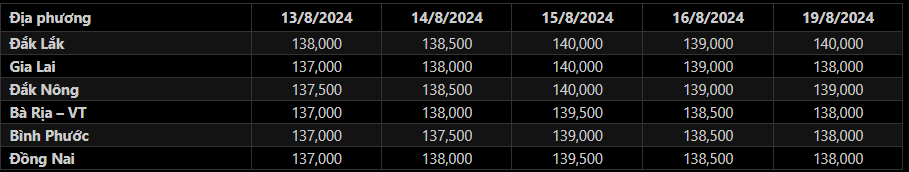 Sáng 19/8/2024, giá tiêu đen xô thu mua tại đại lý ở Tây Nguyên và Đông Nam Bộ diễn biến trái chiều tại hầu hết địa phương so với cuối tuần trước, mặt bằng giá tiêu trung bình tại các địa bàn trọng điểm neo quanh khoảng 138,000-140,000 đồng/kg. Trong đó: