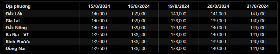 Cùng giao dịch ở mức cao nhất 141,000 đ/kg trong sáng nay là giá tiêu tại Đắk Lắk, Đắk Nông, Bà Rịa-Vũng Tàu và Đồng Nai. Trong đó giá tiêu tại Đắk Lắk không đổi so với ngày hôm qua, trong khi đó giá tiêu tại các đại phương còn lại đồng loạt tăng 1,000 đ/kg.