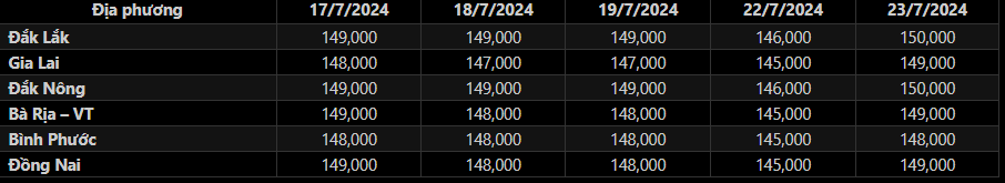 Sáng 23/7/2024, giá tiêu đen xô thu mua tại đại lý ở Tây Nguyên và Đông Nam Bộ bật tăng trở lại, đưa mặt bằng giá tiêu trung bình tại các địa bàn trọng điểm neo quanh ngưỡng 150,000 đồng/kg. Trong đó: