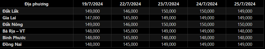 Sáng 25/7/2024, giá tiêu đen xô thu mua tại đại lý ở Tây Nguyên và Đông Nam Bộ giảm nhẹ rải rác tại một vài địa phương so với ngày hôm qua, mặt bằng giá tiêu trung bình tại các địa bàn trọng điểm neo quanh khoảng 148,000-149,000 đồng/kg. Trong đó:
