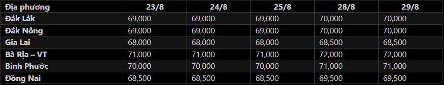 Sáng nay (29/8), giá tiêu đen xô thu mua tại đại lý ở một số khu vực trọng điểm Tây Nguyên đồng loạt ĐI NGANG tại hầu hết địa phương so với ngày hôm qua. Giá tiêu toàn khu vực giao dịch trong khoảng 68,500-72,000 đ/kg, không đổi tại hầu hết địa phương. Trong đó: