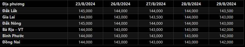 Sáng 29/8/2024, giá tiêu đen xô thu mua tại đại lý ở Tây Nguyên và Đông Nam Bộ giảm 500-1,000 đ/kg so với hôm qua tại hầu hết địa phương so với cuối tuần trước, mặt bằng giá tiêu trung bình tại các địa bàn trọng điểm neo quanh khoảng 142,000-143,500 đồng/kg. Trong đó: