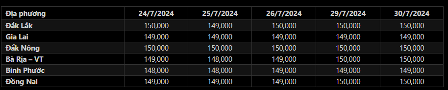 Sáng 30/7/2024, giá tiêu đen xô thu mua tại đại lý ở Tây Nguyên và Đông Nam Bộ ổn định so với cuối tuần trước, mặt bằng giá tiêu trung bình tại các địa bàn trọng điểm neo quanh khoảng 149,000-150,000 đồng/kg. Trong đó: