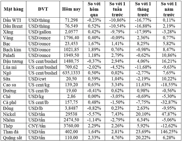 Kết thúc phiên giao dịch cuối tuần giá dầu giảm ghi nhận tuần giảm mạnh nhất trong nhiều tháng, vàng tăng nhẹ, quặng sắt, cao su đều ghi nhận tuần tăng hơn 6%, cà phê arabica mất 2,7% trong tuần.