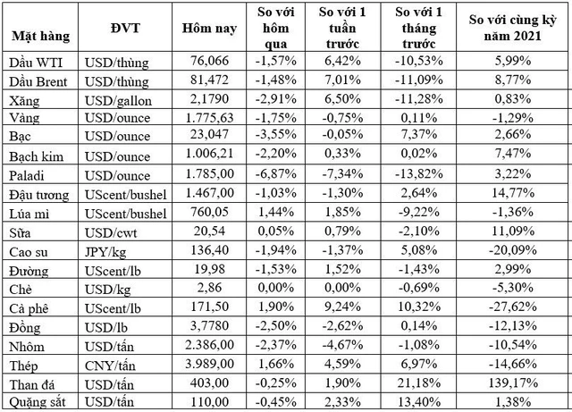 Trên sàn Chicago, giá đậu tương kỳ hạn tháng 1/2023 giảm 8-3/4 US cent xuống 14,73-1/2 USD/bushel. Giá lúa mì đỏ mềm, vụ đông kỳ hạn tháng 3/2023 tăng 8 US cent lên 7,57-1/4 USD/bushel và giá ngô giao cùng kỳ hạn tăng 3 US cent lên 6,53-1/2 USD/bushel.