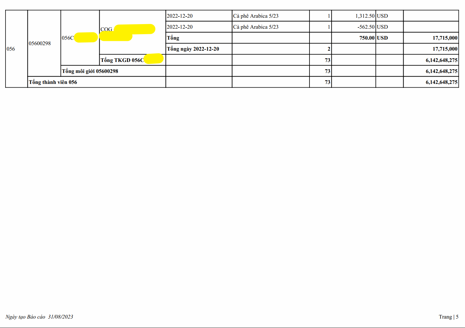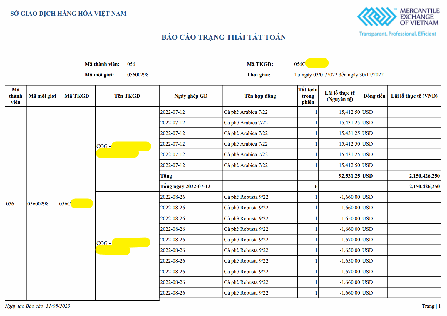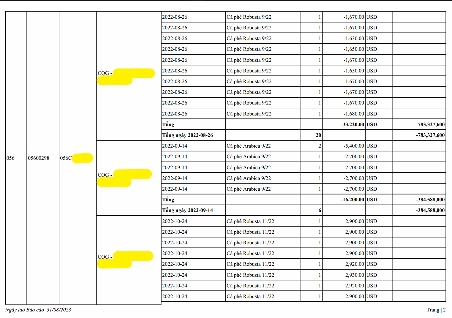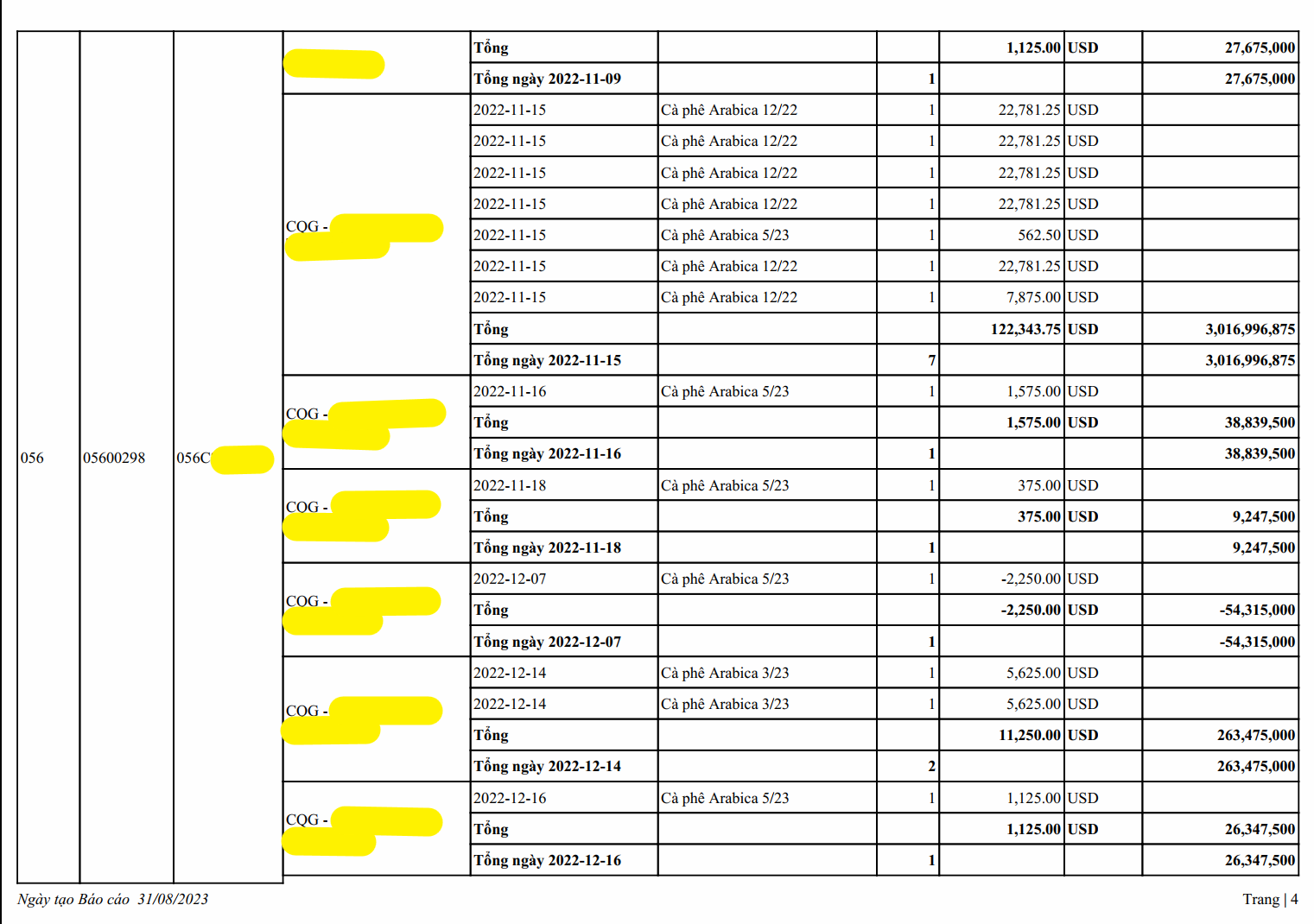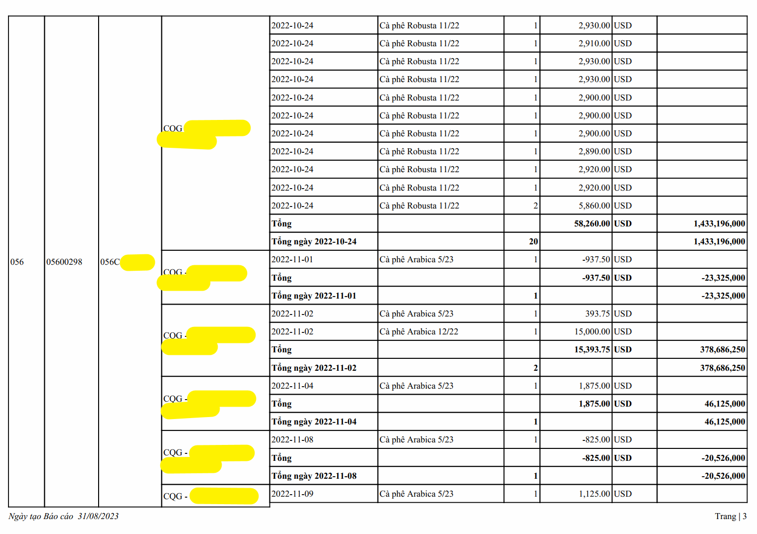 Sao kê lịch sử khách hàng giao dịch Cà phê 01 năm từ ngày 03/01/2022 - 30/12/2022
