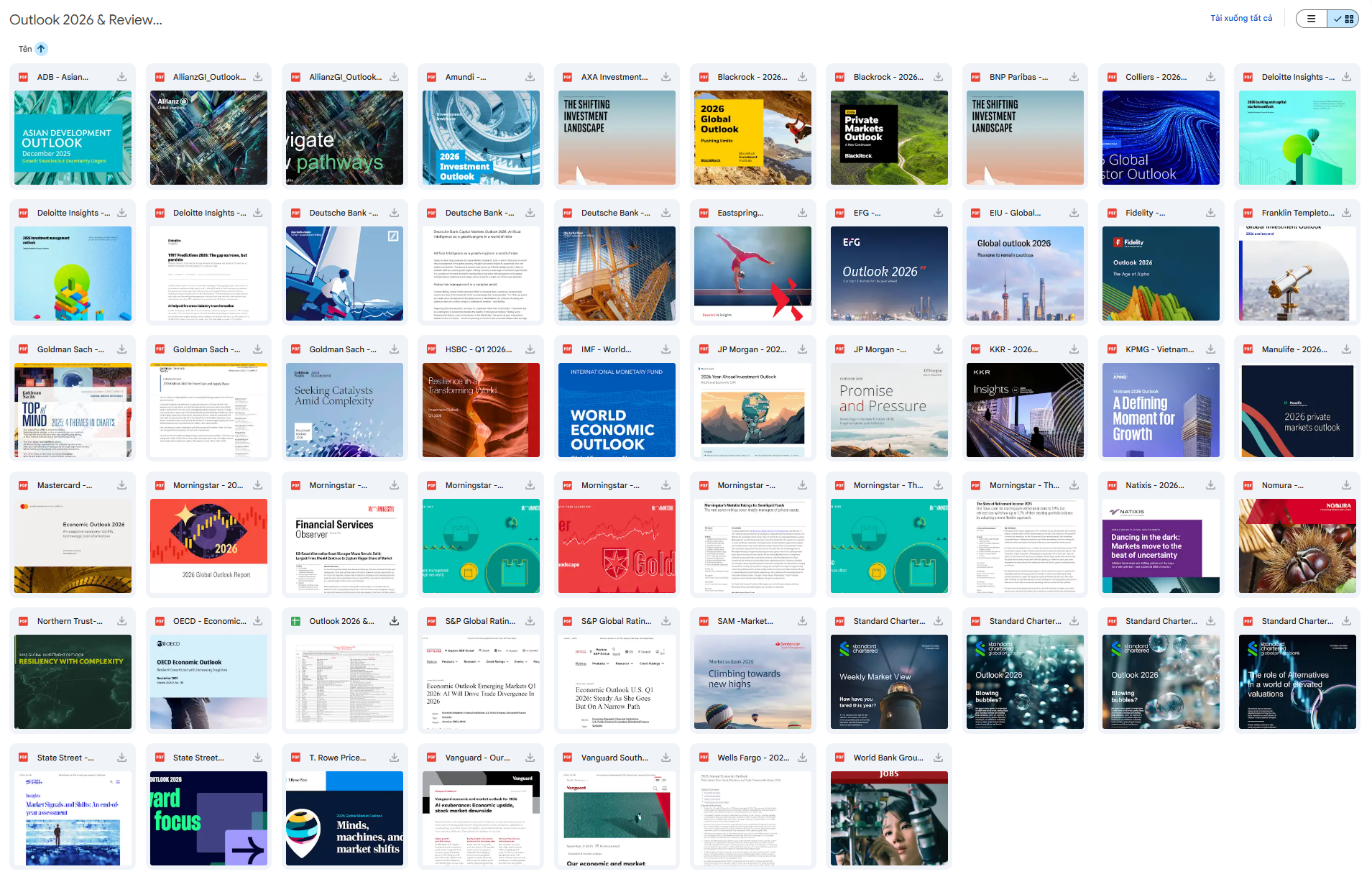 -Thư mục chứa 56 tài liệu PDF về Triển vọng Kinh tế, Thị trường 2026 và các báo cáo liên quan. Nguồn tài liệu có độ tin cậy cao, miễn phí, được tổng hợp từ các Định chế Tài chính Quốc tế; Xếp hạng tín nhiệm toàn cầu; Tập đoàn bảo hiểm hàng đầu; Ngân hàng thương mại và Đầu tư toàn cầu; Top ETF Provider; Top Private Equity; Top Intelligent; Top Private Assetmanagement - Quản lý Tài sản toàn cầu... như World Bank, IMF, OECD, JP Morgan, Goldman Sachs, KPMG, Deloitte, BlackRock, Vanguard, Standard Chartered, HSBC.....
