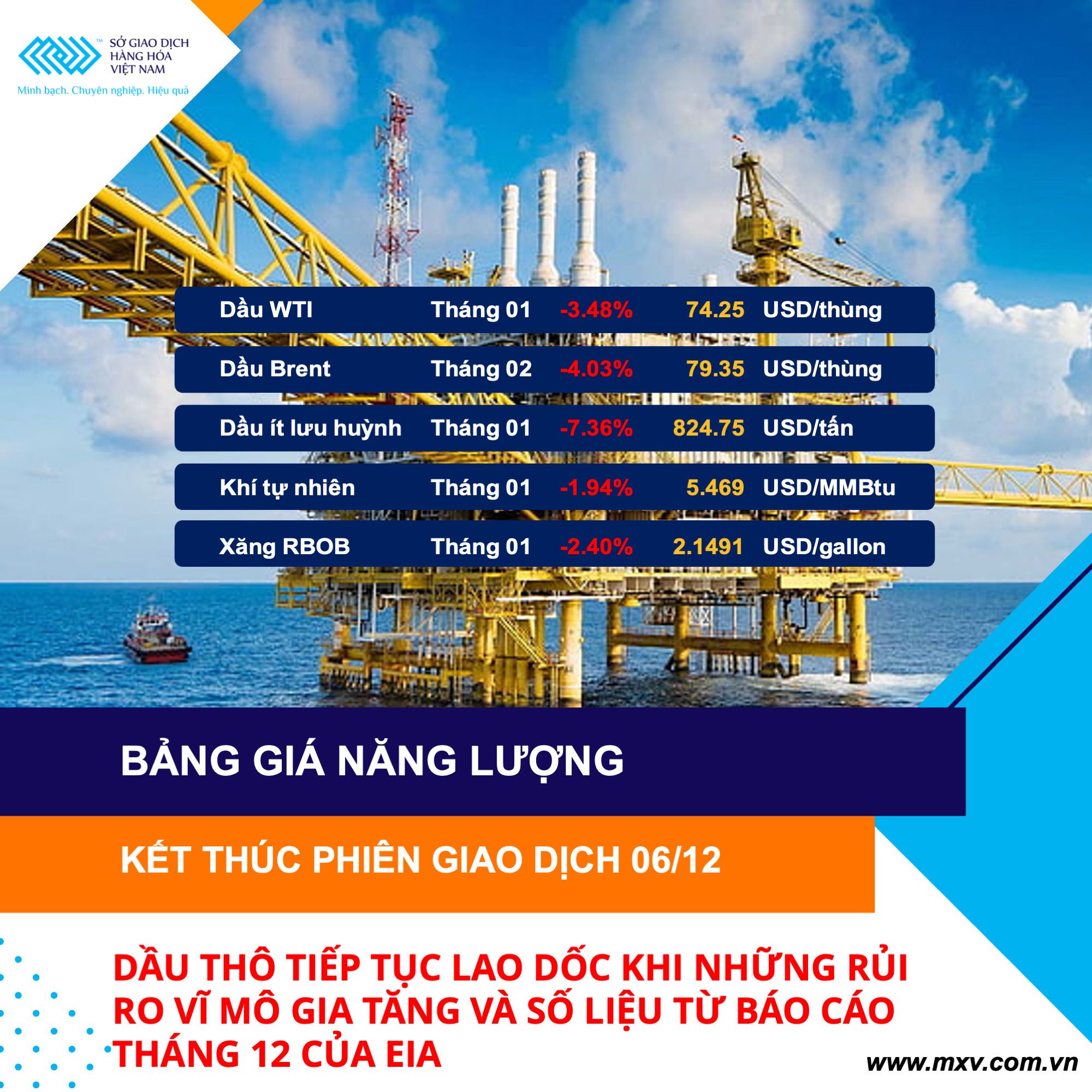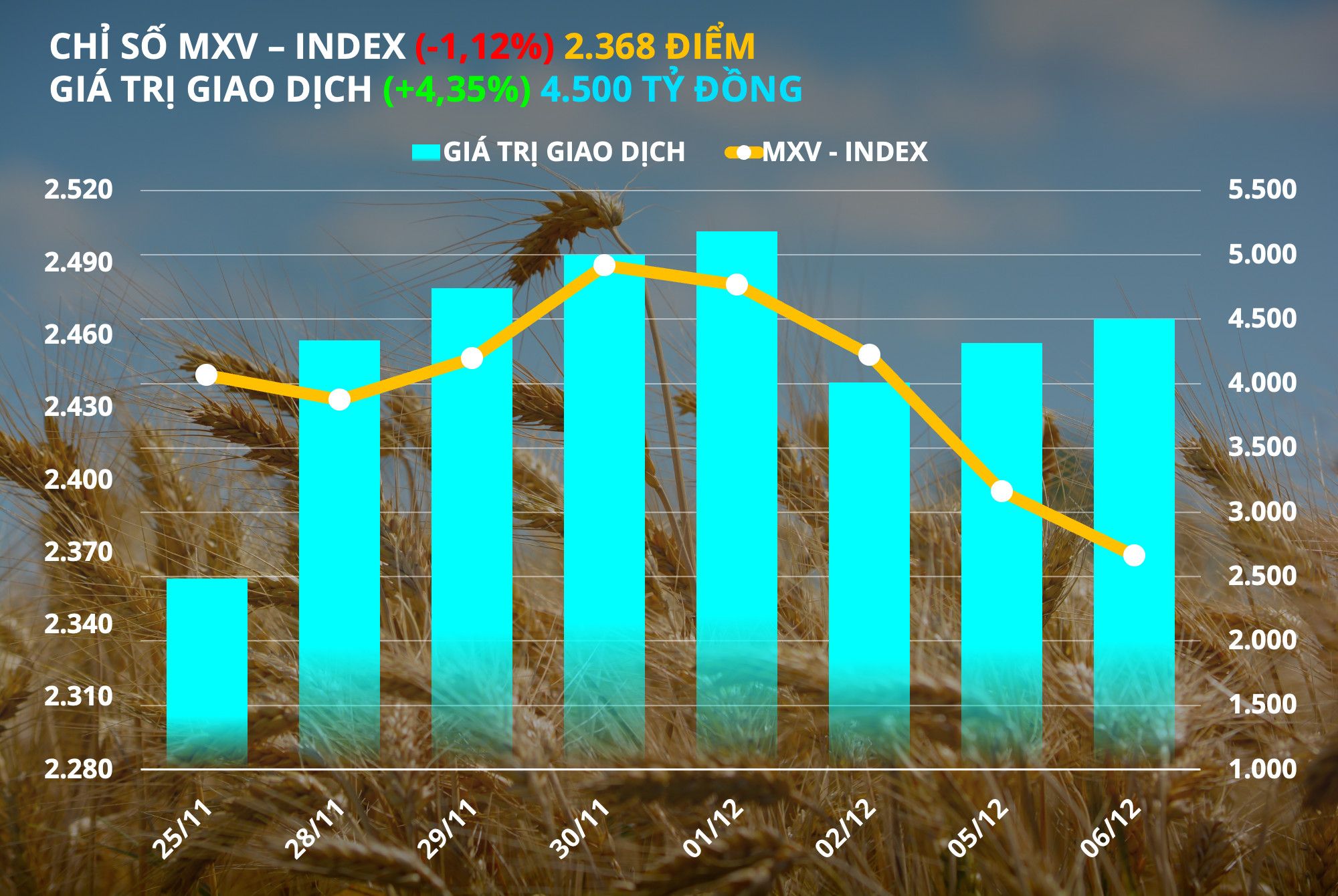 Theo Sở Giao dịch Hàng hóa Việt Nam (MXV), đóng cửa hôm qua (06/12), sắc xanh đỏ đan xen trên bảng giá của 3 nhóm Nông sản, Nguyên liệu công nghiệp và Kim loại. Trong khi đó, lực bán gia tăng mạnh mẽ và hoàn toàn áp đảo trên thị trường Năng lượng. Điều này đã khiến chỉ số hàng hoá MXV- Index giảm 1,12% xuống 2.368 điểm, vùng thấp nhất kể từ đầu năm nay. Tuy nhiên, giá trị giao dịch toàn Sở tiếp tục ổn định quanh mức 4.500 tỷ đồng.