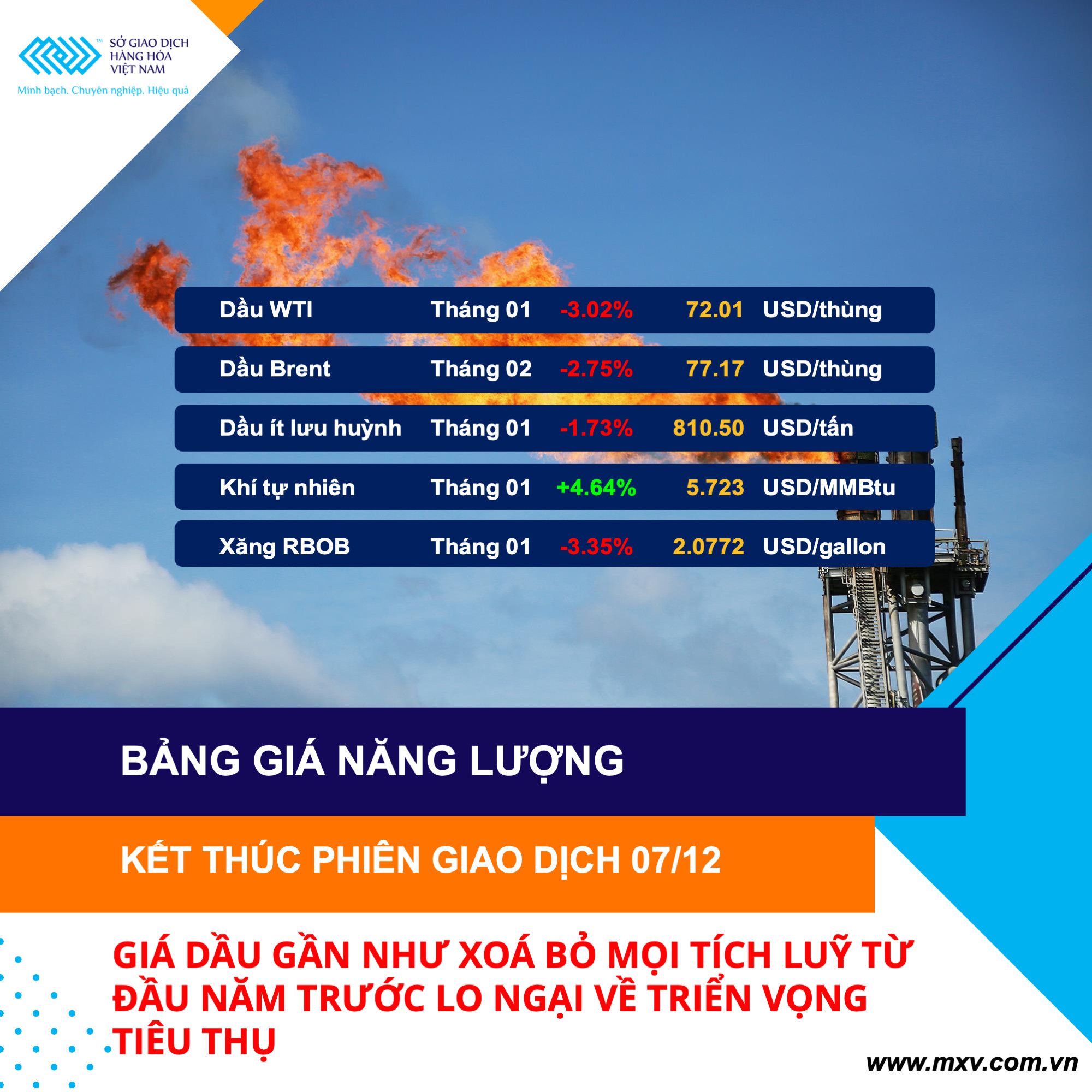 Kết thúc phiên giao dịch ngày 07/12, giá dầu nối dài đà giảm sang phiên thứ 4 liên tiếp và gần như loại bỏ tất cả các tích lũy từ đầu năm nay. Lo ngại về suy thoái kinh tế làm mờ triển vọng tiêu thụ dầu thô đã liên tục tạo sức ép lên giá dầu. Kết phiên, giá dầu WTI kỳ hạn tháng 1 năm sau trên sở NYMEX giảm 3,02% xuống 72,01 USD/thùng. Dầu Brent kỳ hạn tháng 2 năm sau trên sở ICE giảm 2,75% xuống 77,17 USD/thùng.