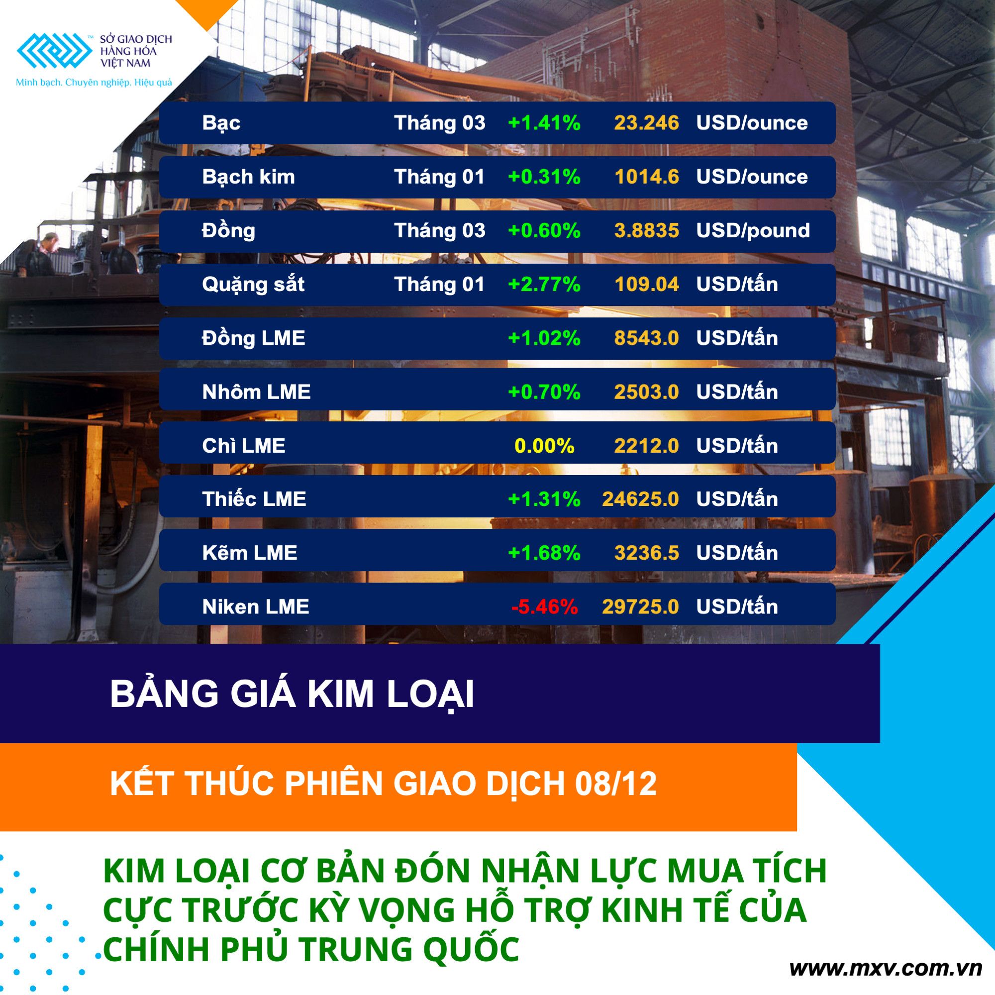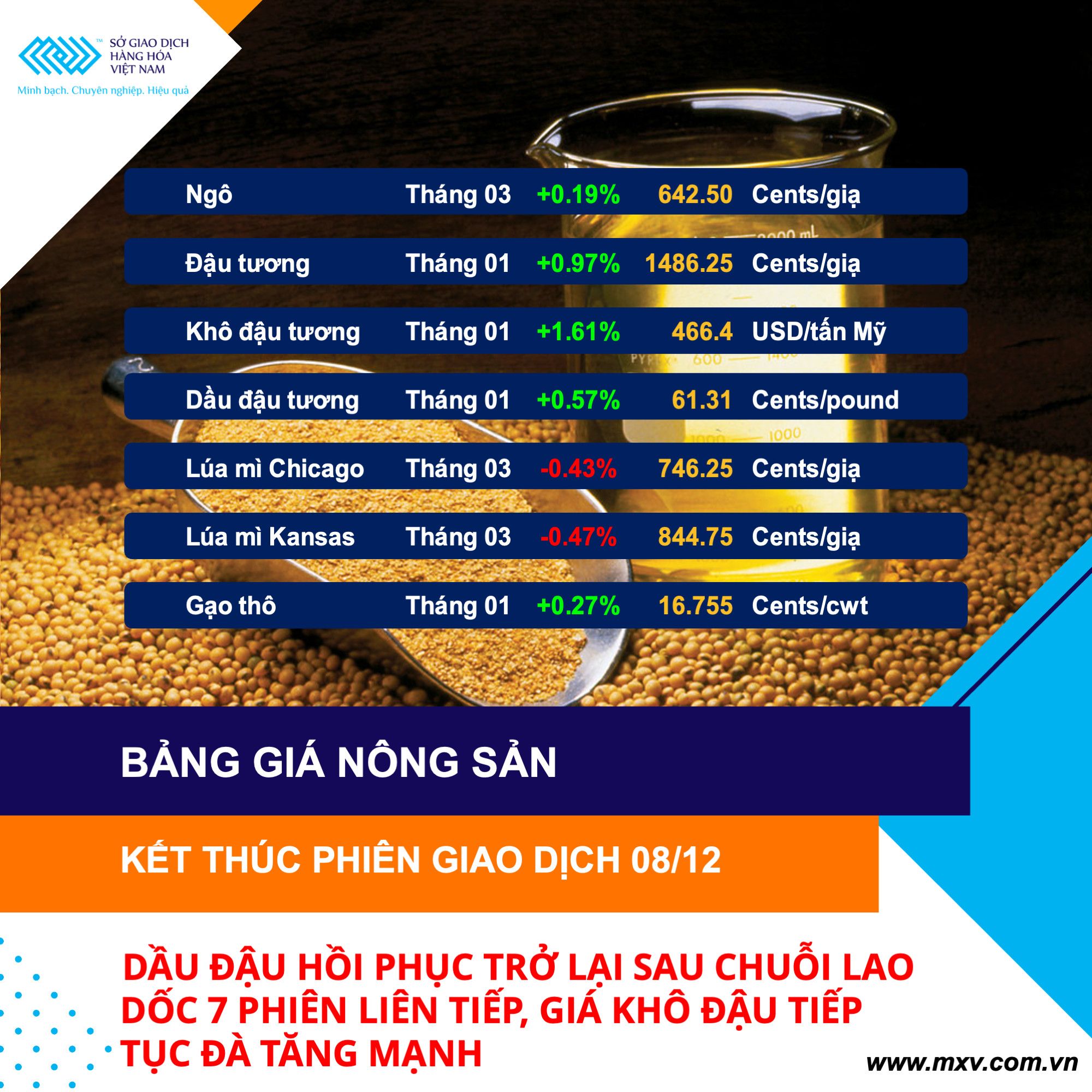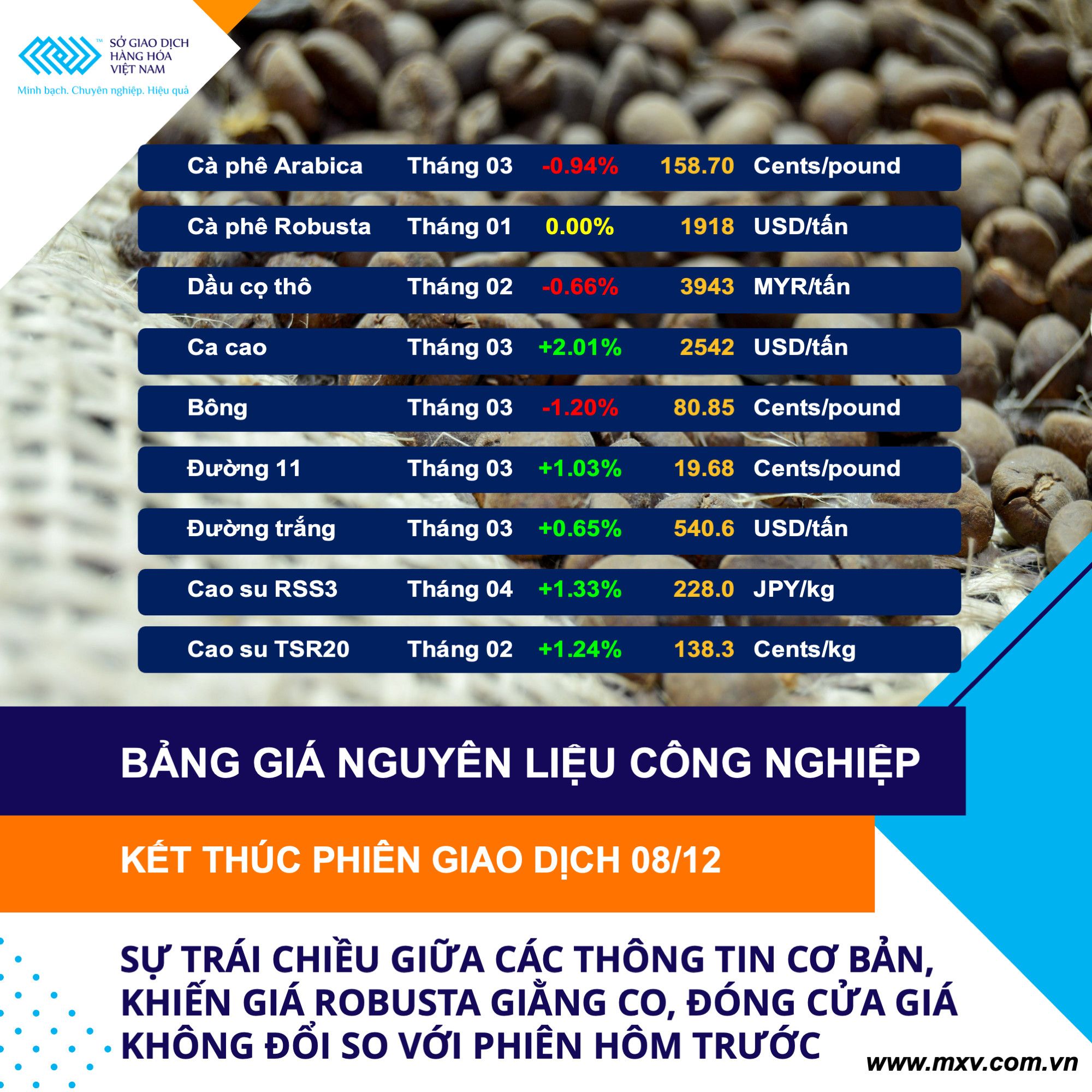 Theo Sở Giao dịch Hàng hoá Việt Nam (MXV), thị trường hàng hoá kết thúc ngày giao dịch hôm qua (08/12) với diễn biến tương đối giằng co. Lực mua có phần chiếm ưu thế, đã hỗ trợ chỉ số MXV- Index đóng cửa tăng nhẹ 0,14% lên 2.379 điểm. Giá trị giao dịch toàn Sở đạt mức 3.000 tỷ đồng.