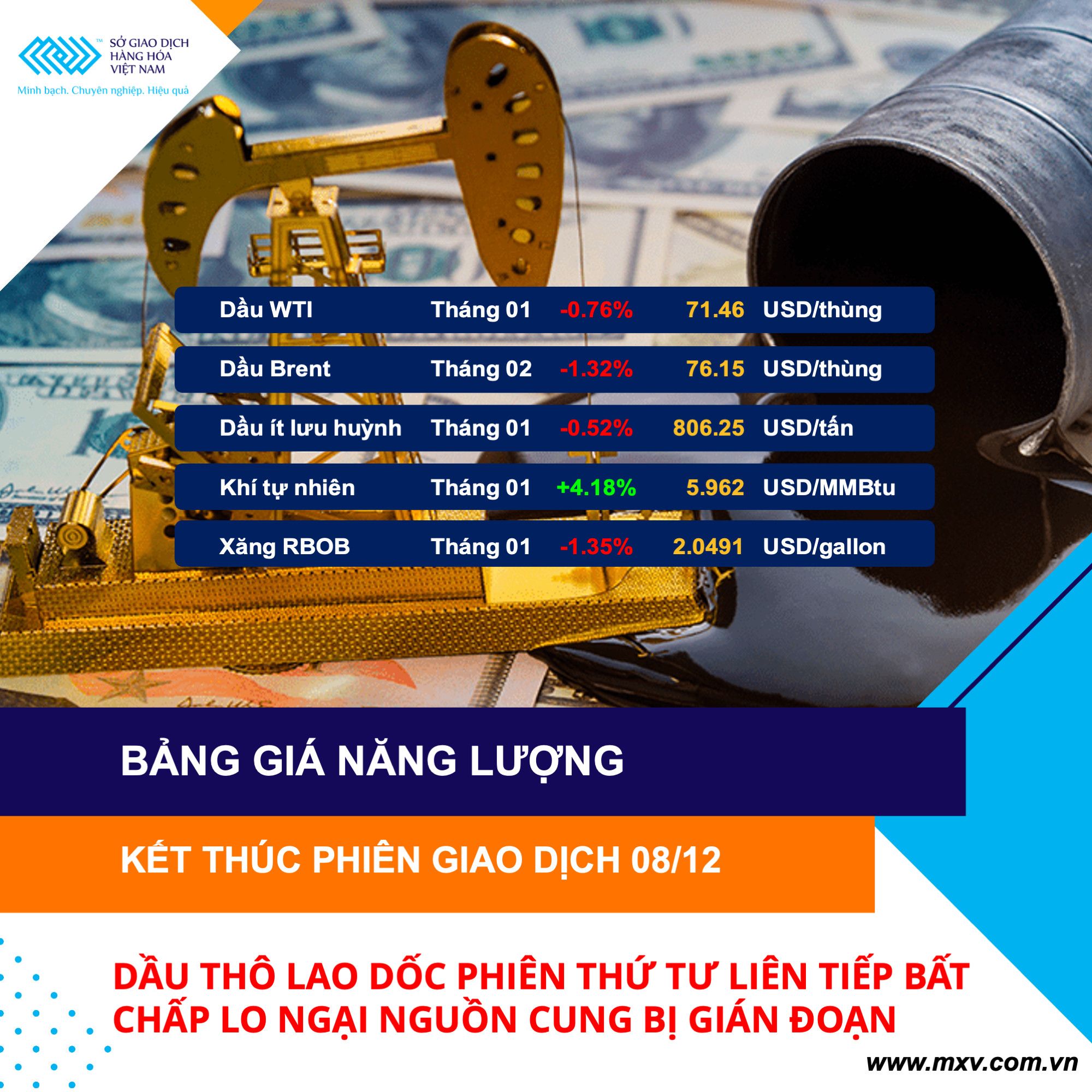 Kết thúc phiên 08/12, giá dầu thô WTI giảm 0,76% về 71,46 USD/thùng, giá dầu thô Brent giảm 1,32% về 76,15 USD/thùng. Trong hai mặt hàng, giá dầu thô WTI biến động mạnh hơn trong phiên hôm qua, bởi thị trường chịu ảnh hưởng từ tin tức đường ống vận chuyển Keystone, liên kết các mỏ dầu ở Canada với các nhà máy lọc dầu của Mỹ đã phải tạm ngừng hoạt động do sự cố rò rỉ dầu.