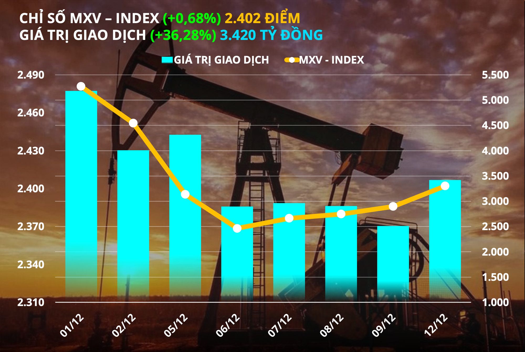 Thị trường hàng hoá tiếp tục cho thấy sự khởi sắc sau tuần giảm giá mạnh trước đó. Đóng cửa hôm qua (12/12) chỉ số MXV- Index nối dài đà tăng sang phiên thứ tư liên tiếp, với mức tăng 0,68% lên 2.402 điểm.