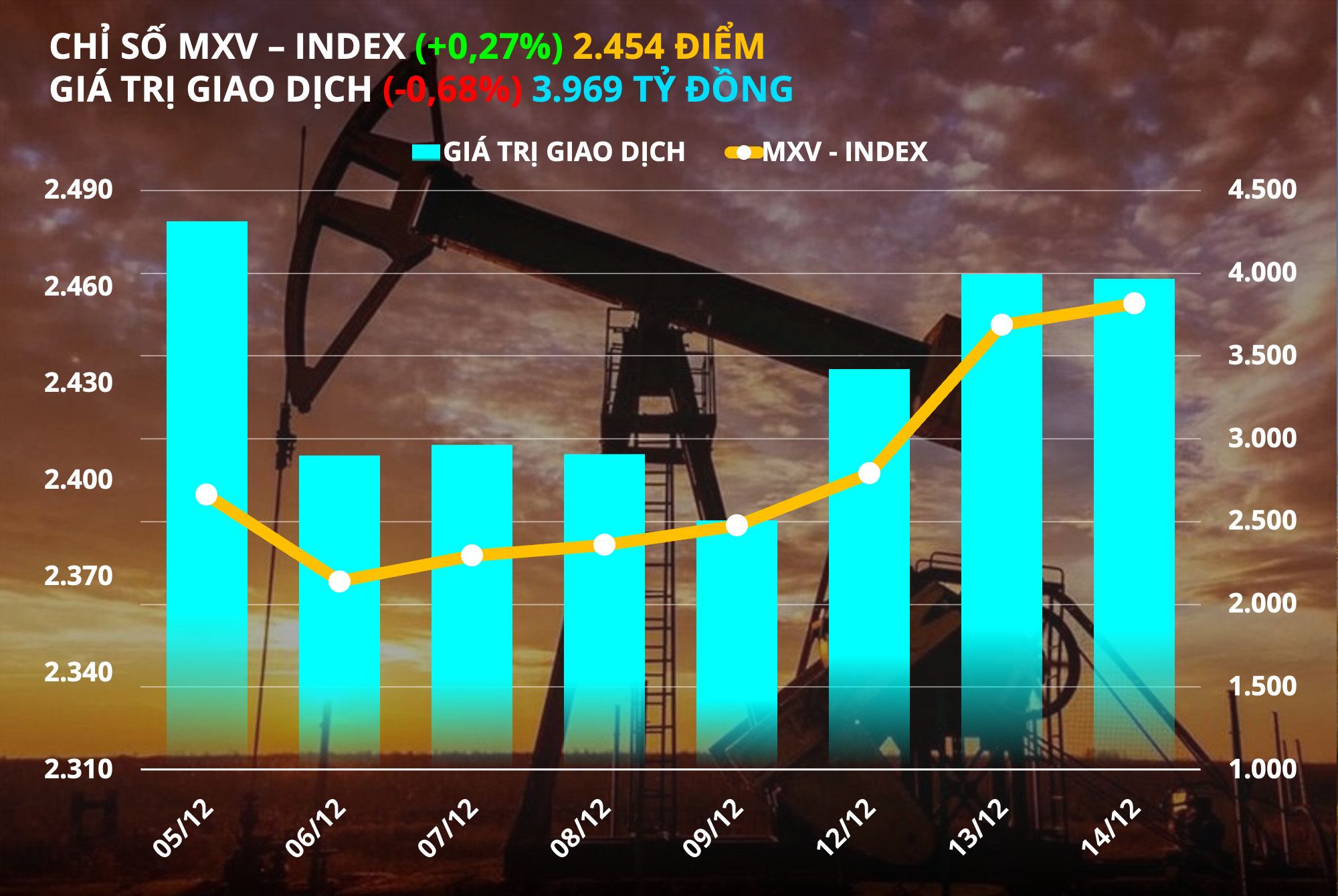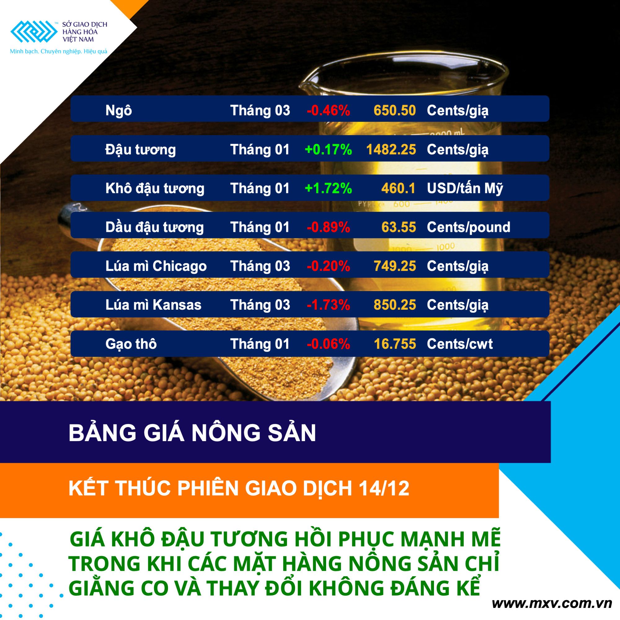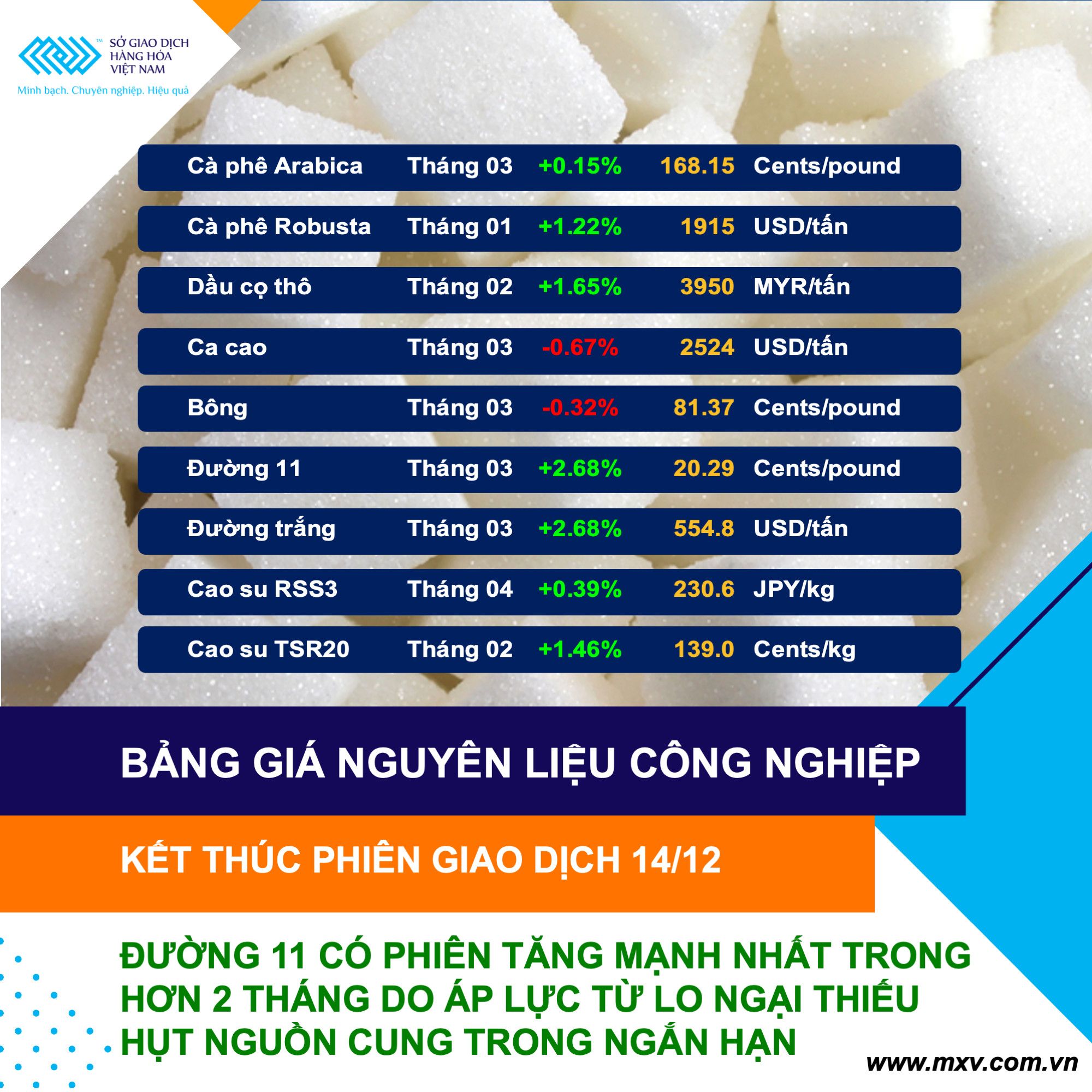 Theo Sở Giao dịch Hàng hoá Việt Nam (MXV), thị trường hàng hoá đóng cửa ngày giao dịch hôm qua 14/12 với diễn biến tương đối giằng co. Lực mua có phần chiếm ưu thế đã hỗ trợ chỉ số MXV- Index nối dài đà tăng sang phiên thứ 6 liên tiếp, với mức tăng 0,27% lên 2.454 điểm. Giá trị giao dịch toàn Sở tiếp tục duy trì ở mức 4.000 tỷ đồng.