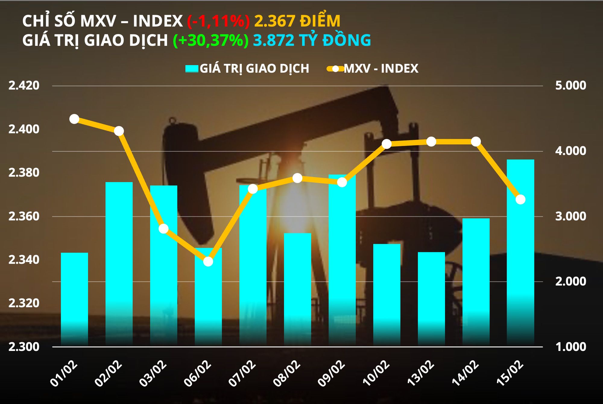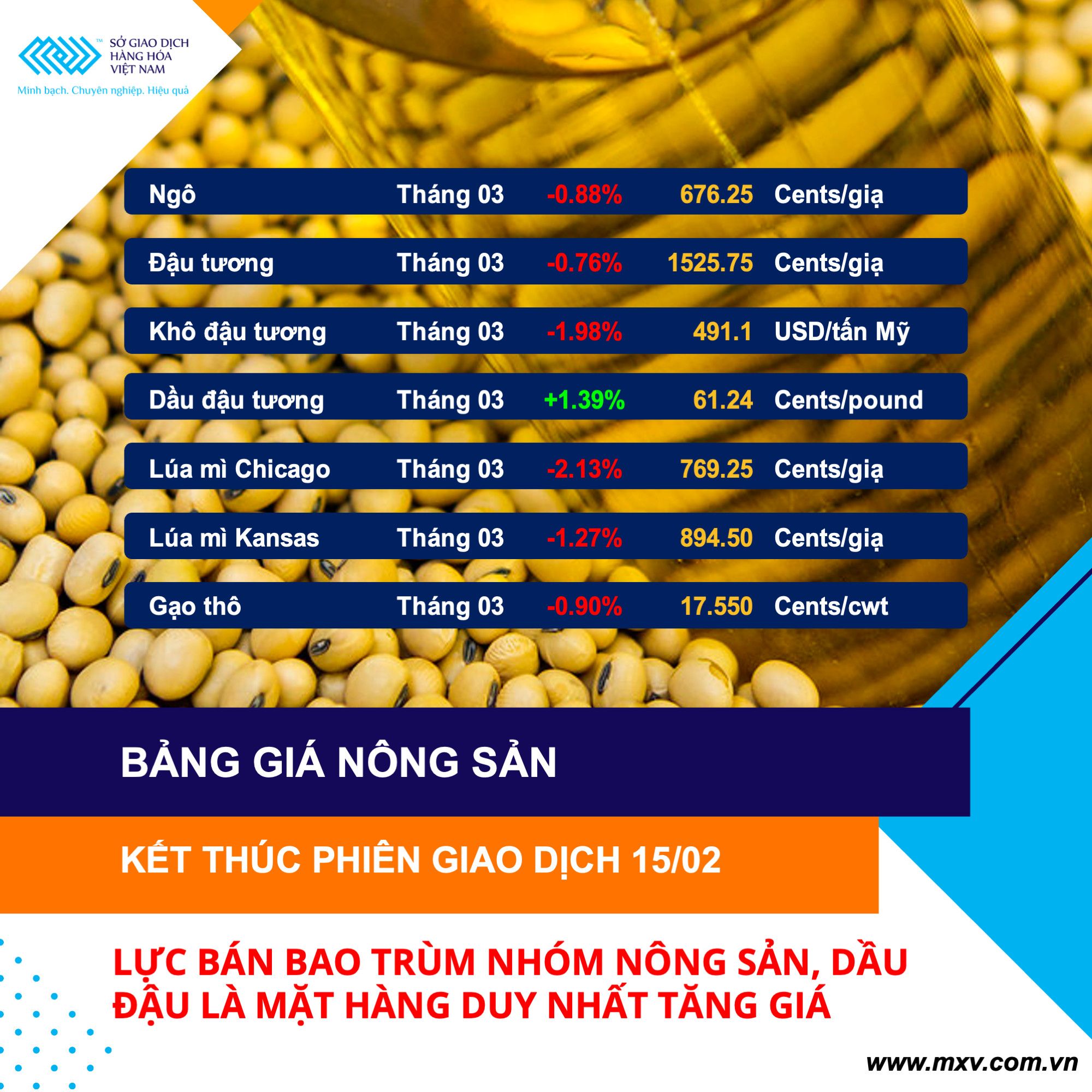 Thông tin từ Sở Giao dịch Hàng hoá Việt Nam (MXV), lực bán hoàn toàn áp đảo trên thị trường hàng hóa nguyên liệu thế giới với sắc đỏ bao phủ toàn bộ bảng giá của cả 4 nhóm mặt hàng Nông sản, Nguyên liệu công nghiệp, Kim loại và Năng lượng. Đóng cửa, chỉ số MXV- Index giảm hơn 1,1% xuống 2.367 điểm.Giá trị giao dịch toàn Sở đạt gần 3.900 tỷ đồng, tăng mạnh hơn 30% so với ngày trước đó. Đặc biệt, dòng tiền đầu tư đã quay trở lại thị trường năng lượng với giá trị giao dịch tính riêng nhóm tăng gấp đôi so với ngày 14/02, đạt mức gần 1.700 tỷ đồng, chiếm hơn 40% tổng giá trị giao dịch toàn Sở.