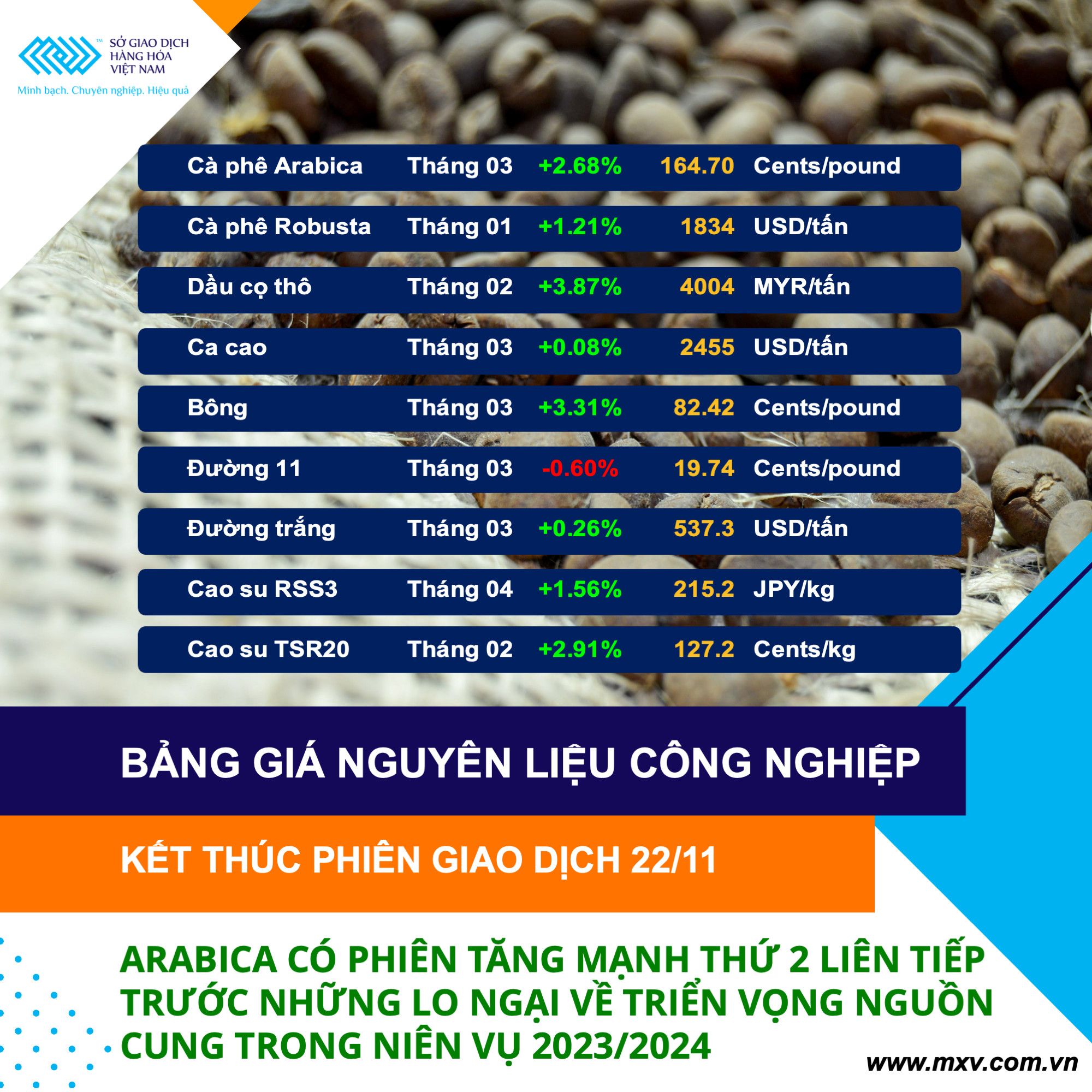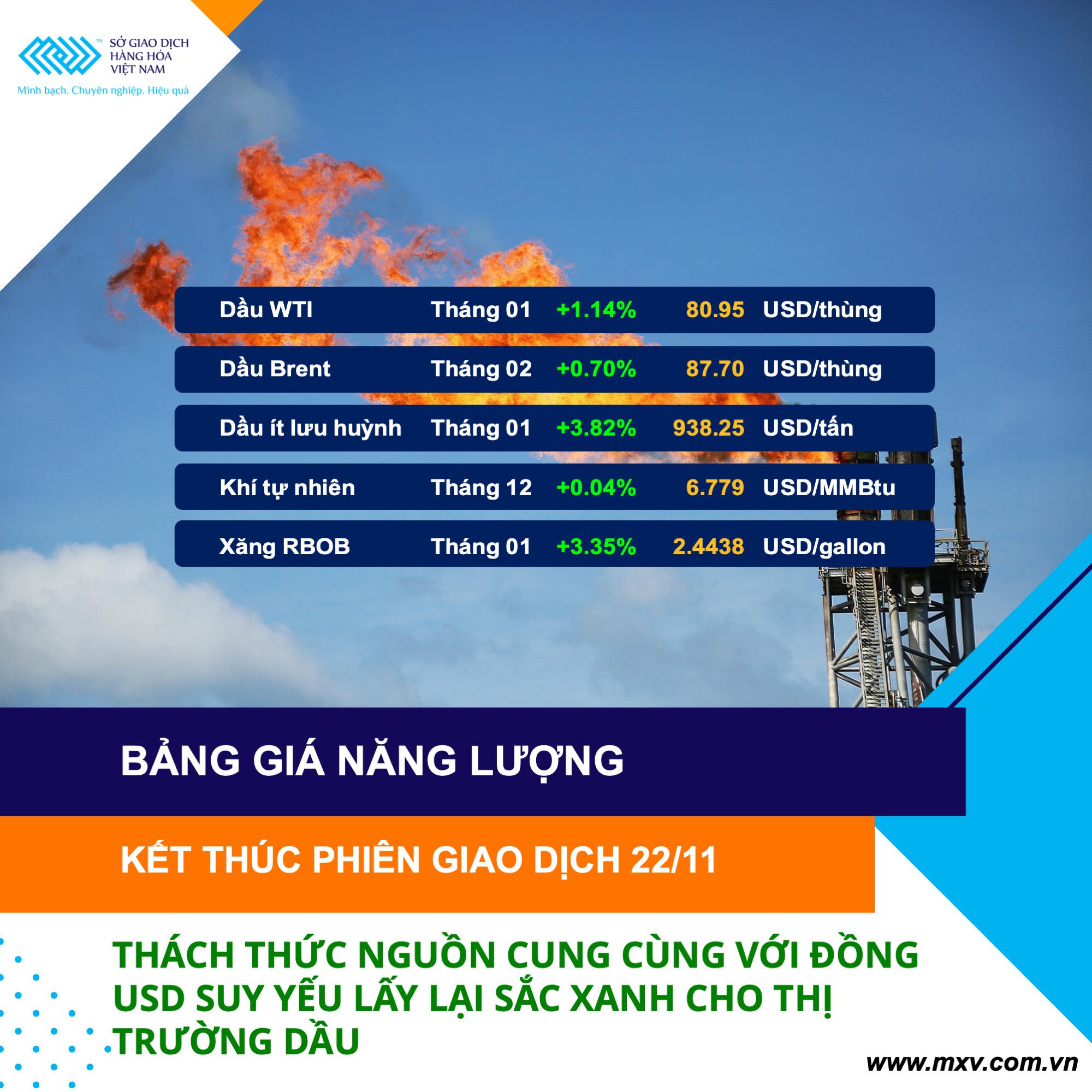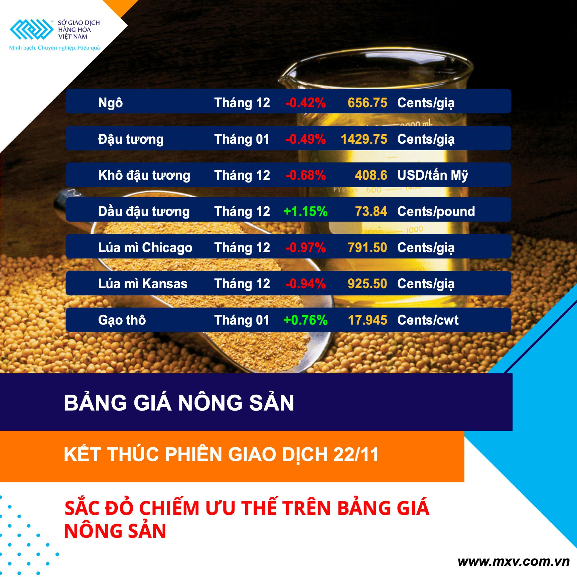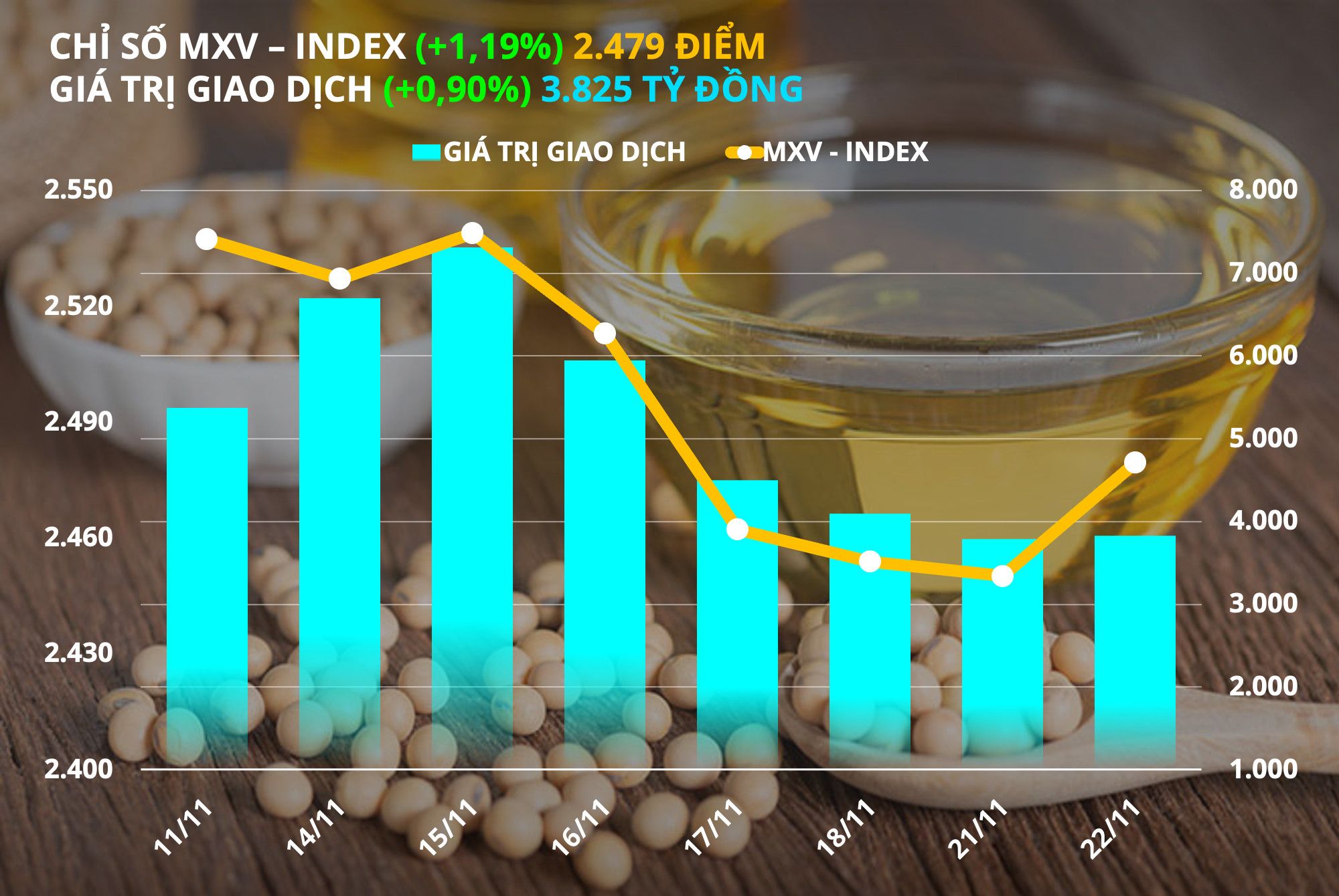 Theo Sở Giao dịch Hàng hoá Việt Nam (MXV), lực mua đã quay trở lại và chiếm ưu thế trên thị trường hàng hoá trong phiên giao dịch kết thúc ngày 22/11. Điều này đã khiến cho chỉ số MXV-Index đảo chiều tăng 1,19% sau 2 ngày suy yếu liên tiếp, đạt mức 2.479 điểm.