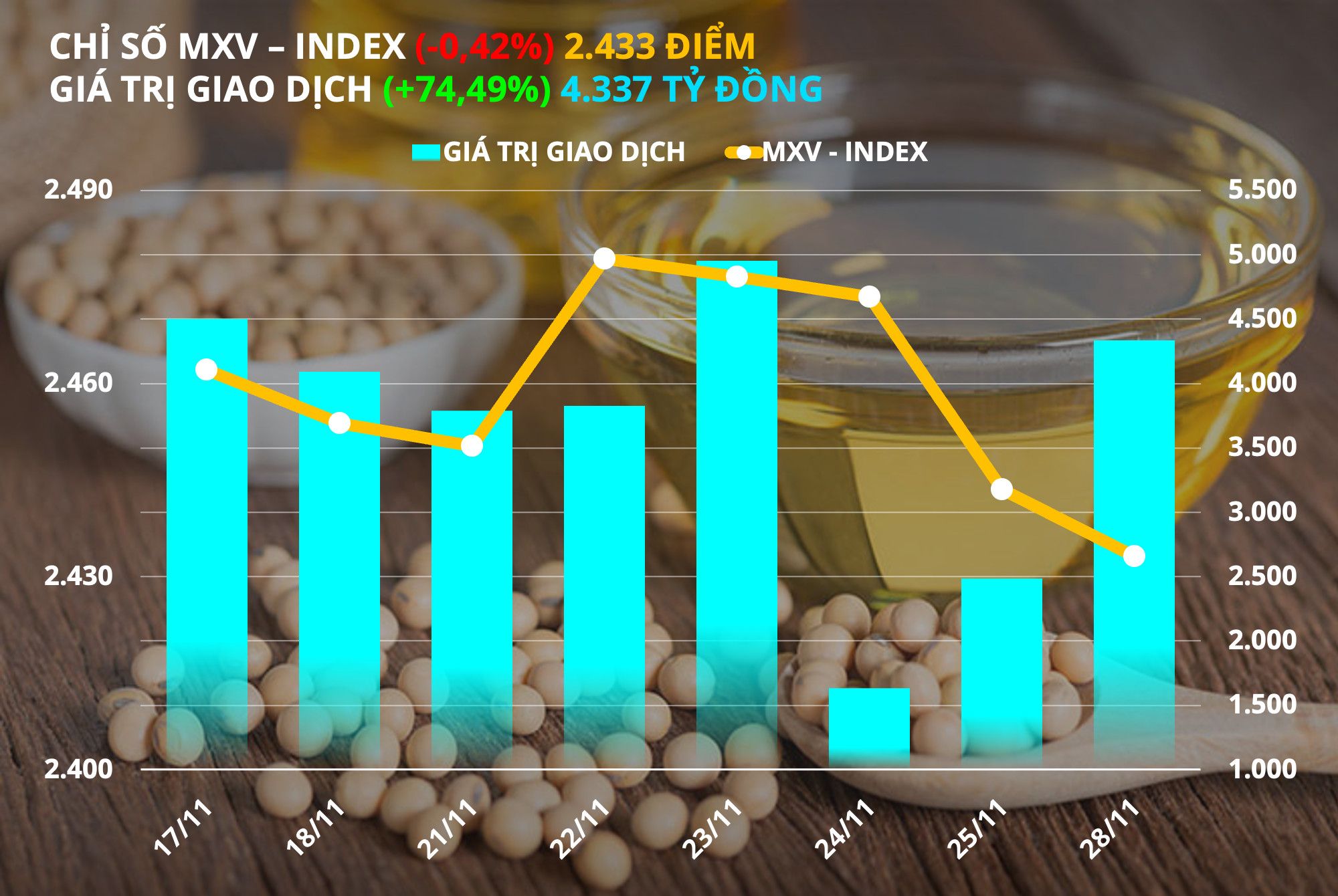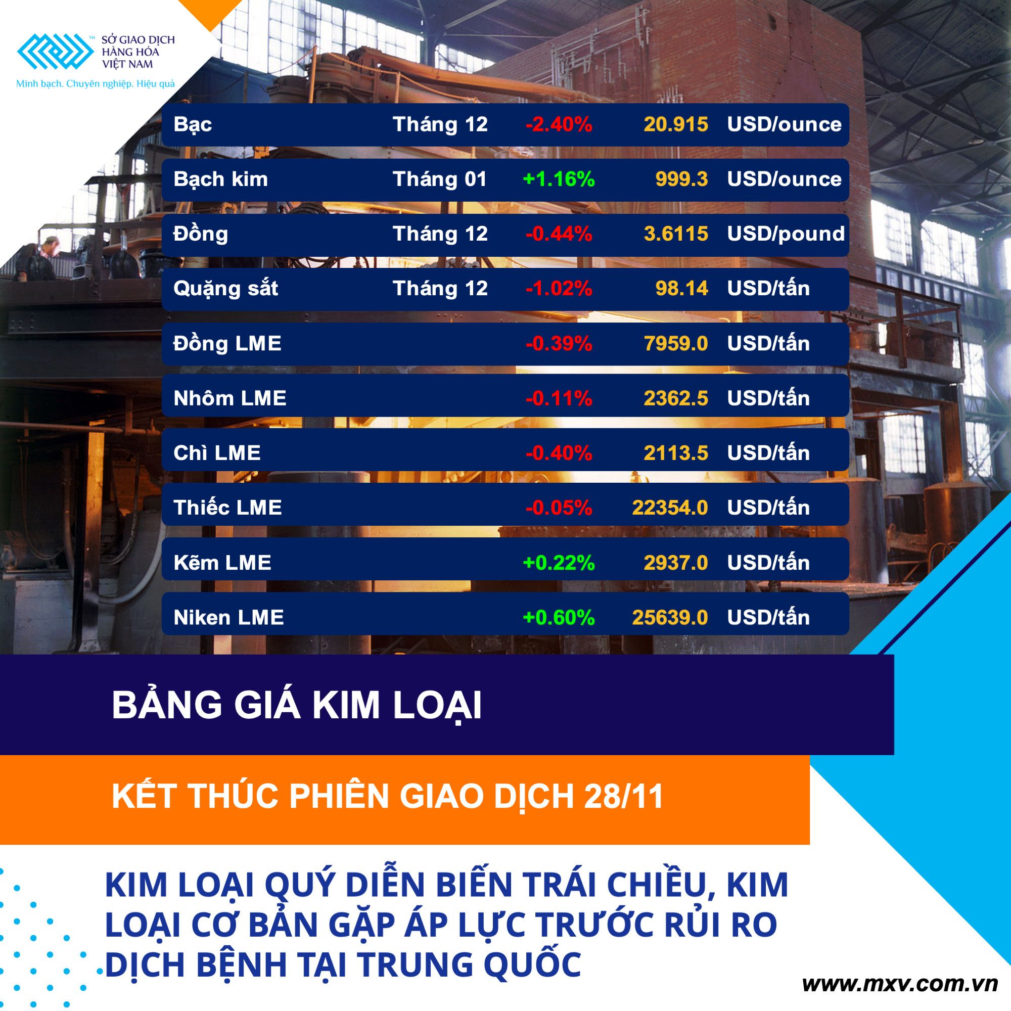 Kết thúc phiên giao dịch đầu tuần ngày 28/11, các mặt hàng được giao dịch liên thông thế giới tại Sở Giao dịch Hàng hoá Việt Nam (MXV) ghi nhận diễn biến có phần trái chiều. Tuy nhiên, đà suy yếu khá mạnh của nhiều mặt hàng vẫn khiến chỉ số MXV-Index nối dài đà giảm sang ngày thứ 5 liên tiếp, với mức giảm 0,42% xuống còn 2.433,15 điểm