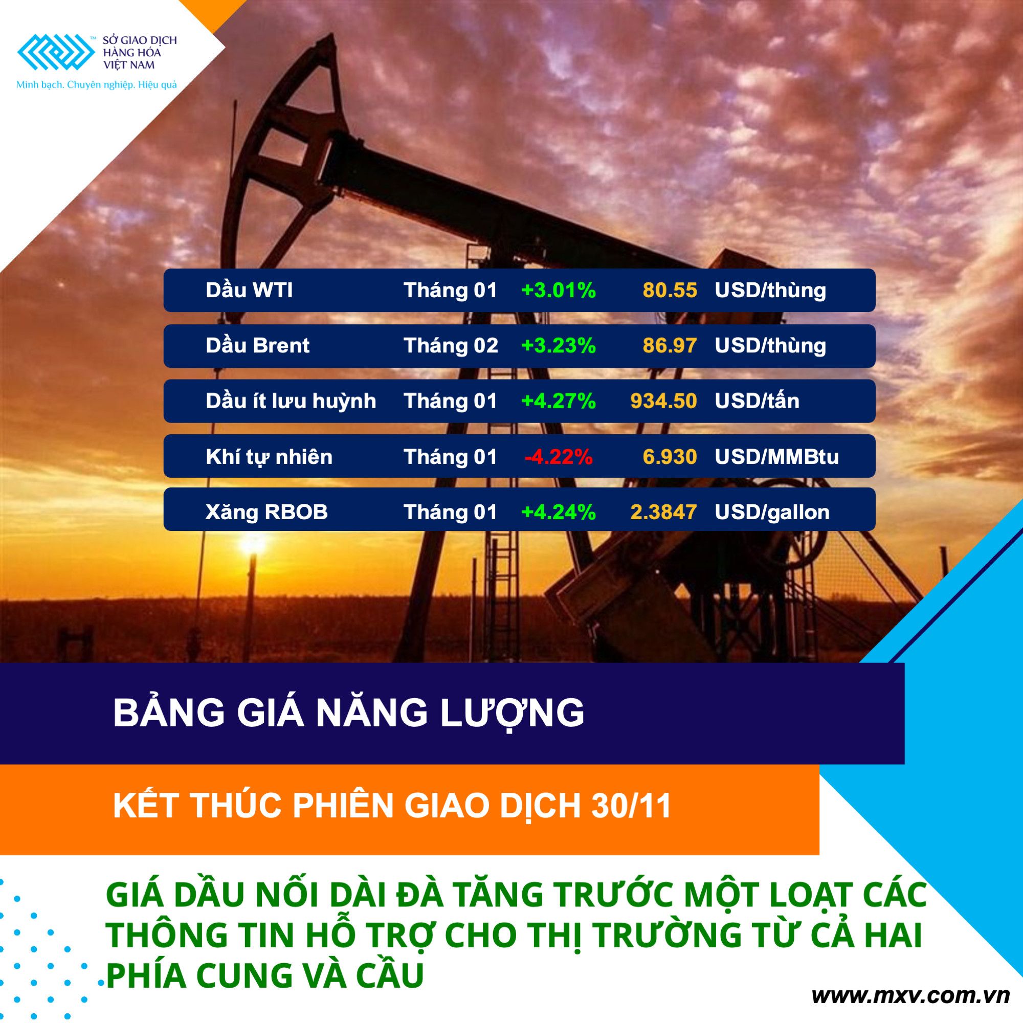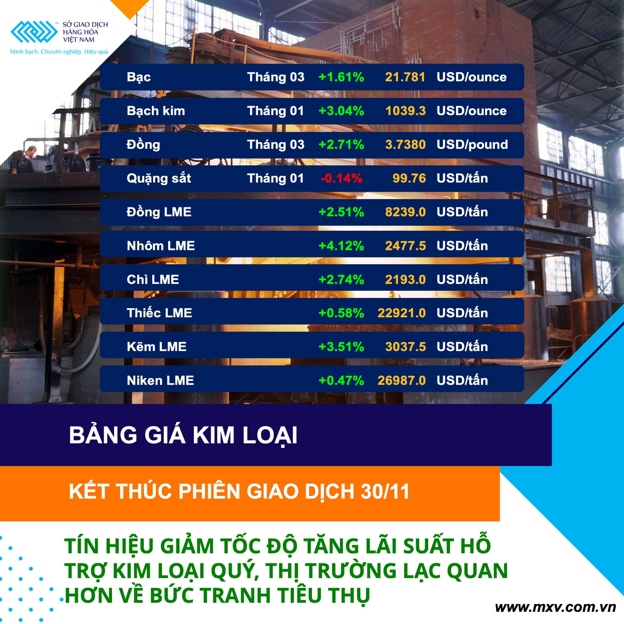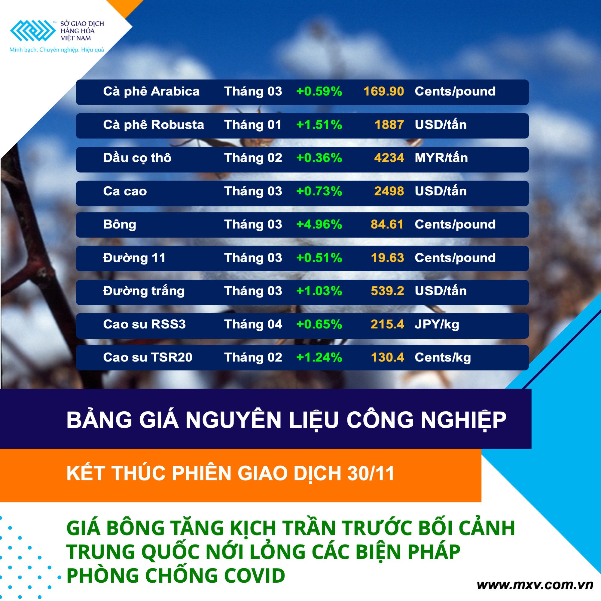 heo Sở Giao dịch Hàng hoá Việt Nam (MXV), đóng cửa ngày giao dịch cuối cùng của tháng 11, thị trường hàng hóa đón nhận lực mua rất tích cực. Sắc xanh hoàn toàn áp đảo khi chỉ có 4 mặt hàng giảm giá trên tổng số 31 hàng hoá nguyên liệu đang được giao dịch liên thông thế giới tại MXV. Điều này đã hỗ trợ chỉ số MXV- Index tiếp tục tăng 1,56% lên 2.488 điểm. Giá trị giao dịch toàn Sở cũng tăng hơn 5,5%, đạt mức trên 5.000 tỷ đồng.