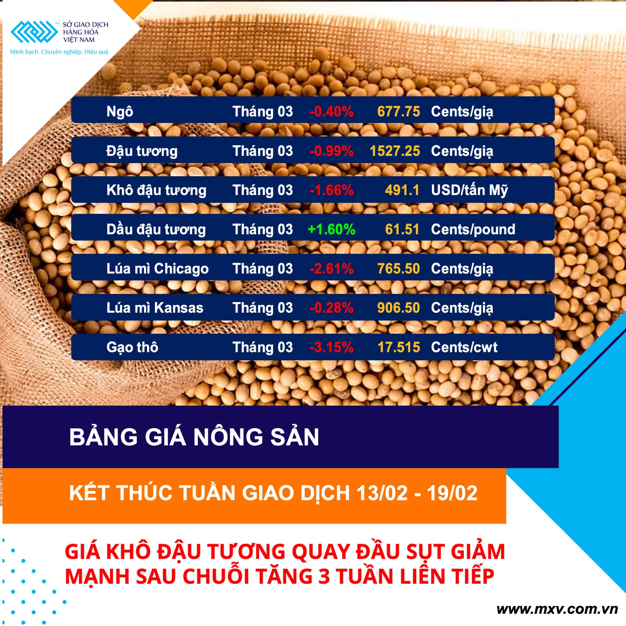 Thông tin từ Sở Giao dịch Hàng hoá Việt Nam (MXV), đóng cửa tuần giao dịch vừa qua (13/02 - 19/02), ngoại trừ nhóm Nguyên liệu công nghiệp, lực bán hoàn toàn áp đảo trên 3 nhóm mặt hàng còn lại là Nông sản, Năng lượng và Kim loại. Đà giảm rất mạnh của nhiều mặt hàng quan trọng đã kéo chỉ số Hàng hoá MXV- Index quay đầu suy yếu hơn 1,7% xuống mức 2.352 điểm.