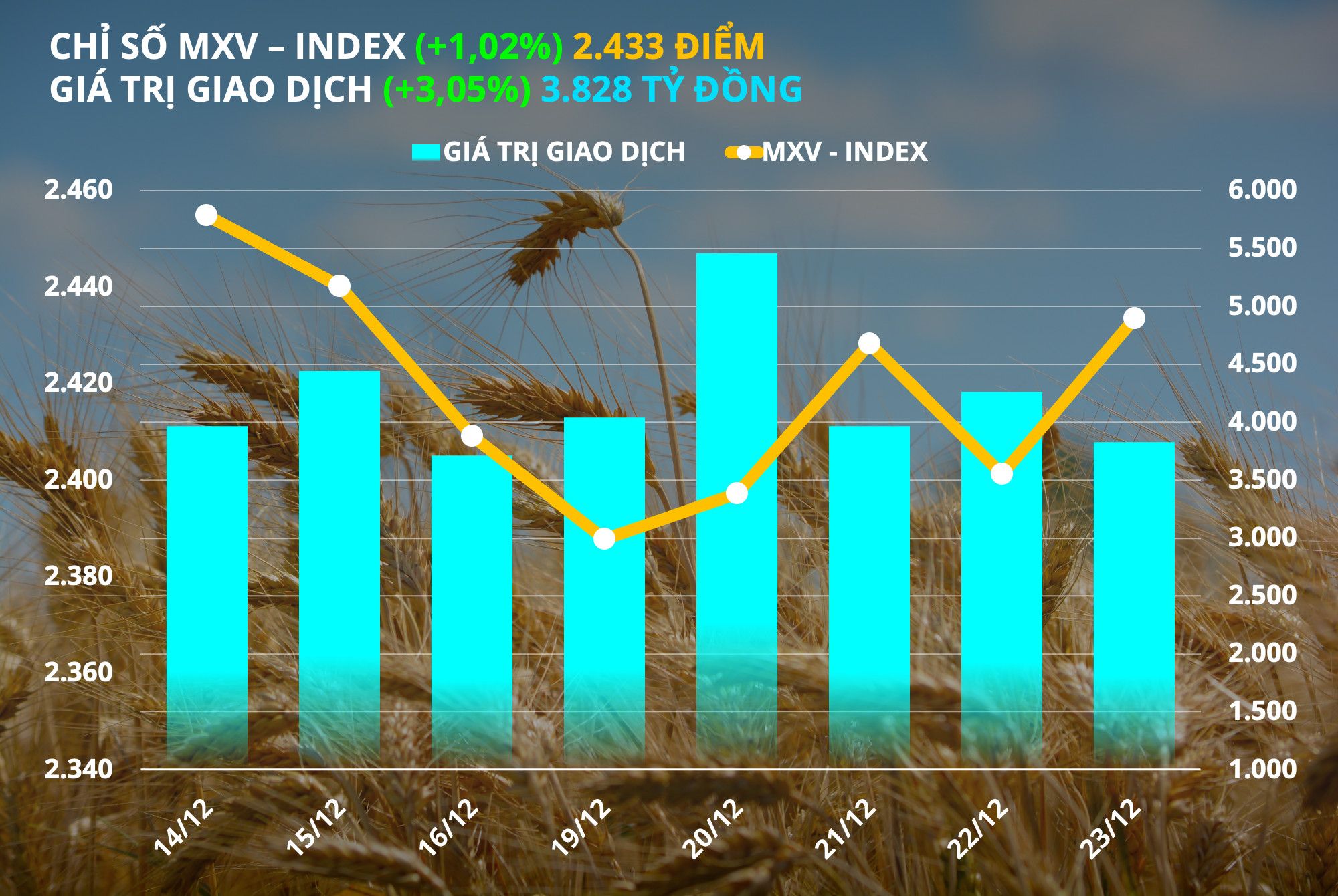 Sắc xanh cho thấy xu hướng áp đảo trên thị trường hàng hoá, giúp chỉ số MXV-Index tiếp tục khởi sắc với mức tăng 1,02% lên 2.433,54 điểm, mức cao nhất trong vòng 3 tuần qua.