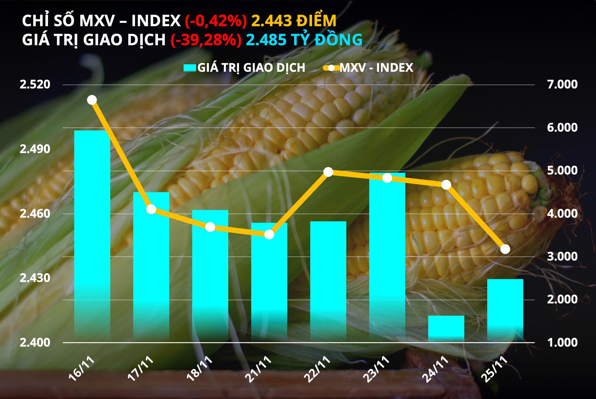 Theo Sở Giao dịch Hàng hoá Việt Nam (MXV), thị trường hàng hoá đóng cửa tuần giao dịch vừa qua (21/11-27/11) với lực bán chiếm ưu thế. Chỉ số MXV- Index giảm 0,42% xuống 2.443 điểm, đánh dấu tuần giảm thứ 3 liên tiếp.