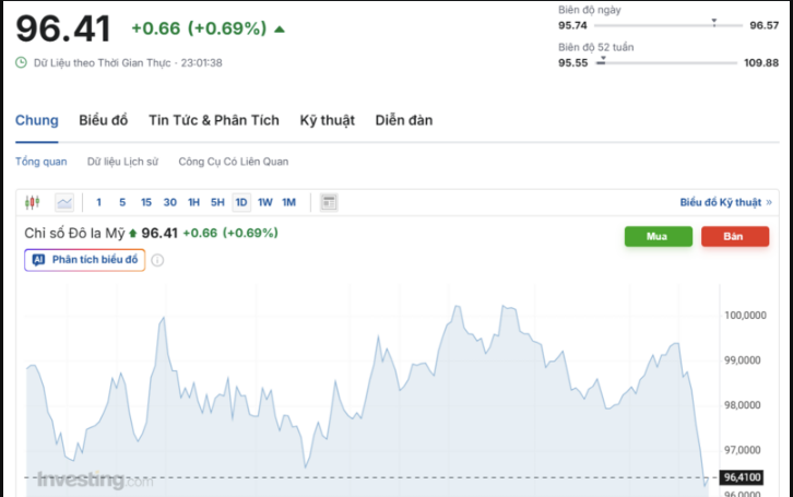 Chỉ số Dollar Index (DXY), đo lường đồng USD với 6 đồng tiền chủ chốt (EUR, JPY, GBP, CAD, SEK, CHF), đã dừng ở mức 96,41 điểm, tăng 0.66% so với chốt phiên lần trước.