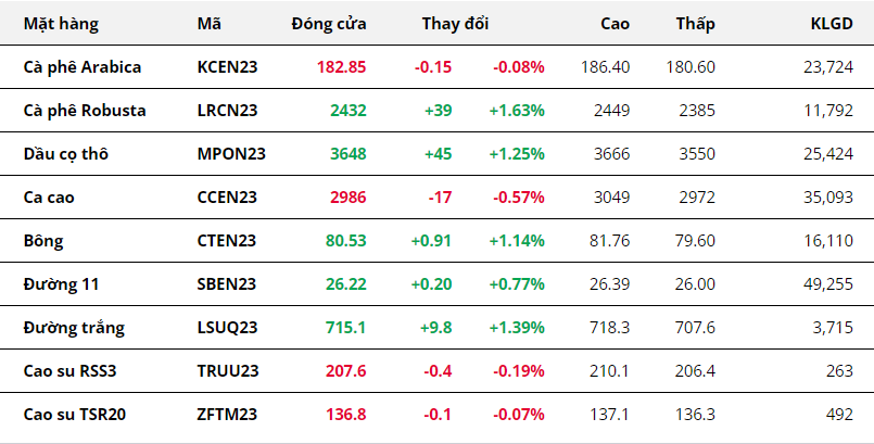 Giá bông biến động mạnh sau những dữ liệu trái chiều về cung – cầu bông của Bộ Nông nghiệp Mỹ (USDA), đóng cửa giá tăng 1,14% so với mức tham chiếu. Ban đầu, giá bông tăng lên sát mức 82 cents khi USDA dự đoán nhu cầu tiêu thụ toàn cầu trong niên vụ 2023/24 tăng mạnh 6,6 triệu kiện so với niên vụ hiện tại, lên 116,2 triệu kiện, mức cao thứ 2 trong 5 năm trong Báo cáo ước tính cung – cầu nông sản tháng 05 (WASDE).