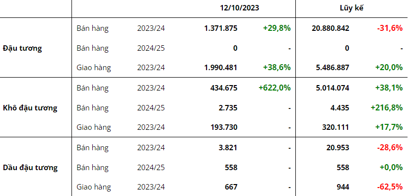 Bộ nông nghiệp Mỹ (USDA) vừa phát hành báo cáo Xuất khẩu hàng tuần (Export Sales) với các số liệu quan trọng trong tuần từ 6/10 đến 12/10 như sau: