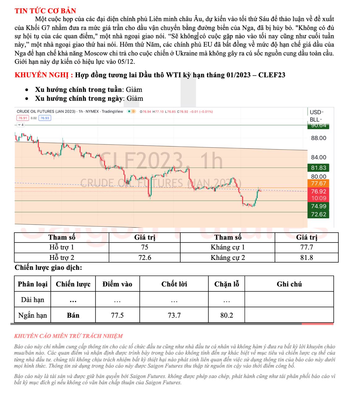 -View kỹ thuật dầu thô WTI kỳ hạn tháng 01/2022 (CLEF23) đầu ngày 29/11/2022