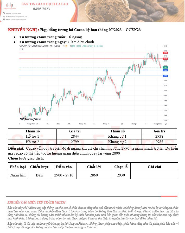 -View kỹ thuật Cacao kỳ hạn tháng 07/2023 (CCEN23) đầu ngày 04/05/2023